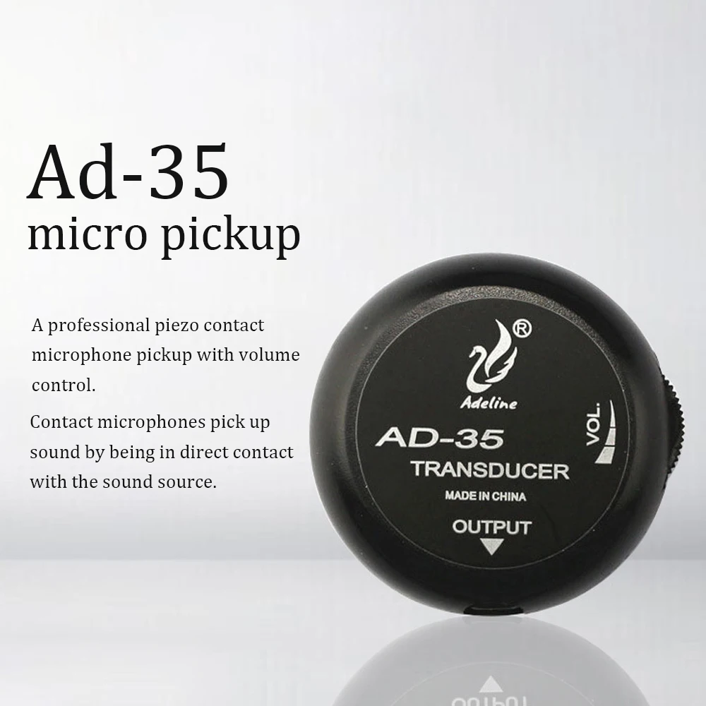AD-35 известен как разновидность пьезоэлектрических пикапов, которые пользуются популярностью у strummers и нежного игрока в стиле fingerstyle, а также зарекомендовал себя как хороший Пикап для небольшой производительности. Он также предназначен для бережного обращения с вами и правильной установки, не повредит финишную обработку гитары или розетку. Мгновенное крепление, просто наклеив на маркер, без каких-либо повреждений вашей гитары. Оснащен 3 м линия вывода аудиосигнала с высокими показателями отзывы устойчивостью.