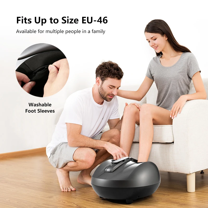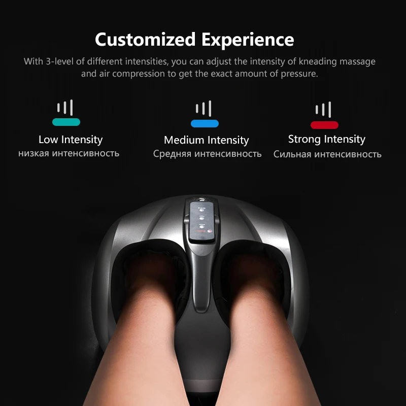 -Облегчение боли: прокатка, тепловое, шиацу глубокое разминание, сжатие воздуха, нагревание. 3 режима и 3 уровня интенсивности подушки безопасности могут удовлетворить потребности большинства людей. Есть массажные точки для пальцев ног, арок и подошвы ног, а ступни и каблуки полностью обернуты воздушными мешками. Вы можете воспользоваться услугами профессионального массажа дома, стимулируя кровообращение, снимая Фасциит, боль и усталость и т. д.