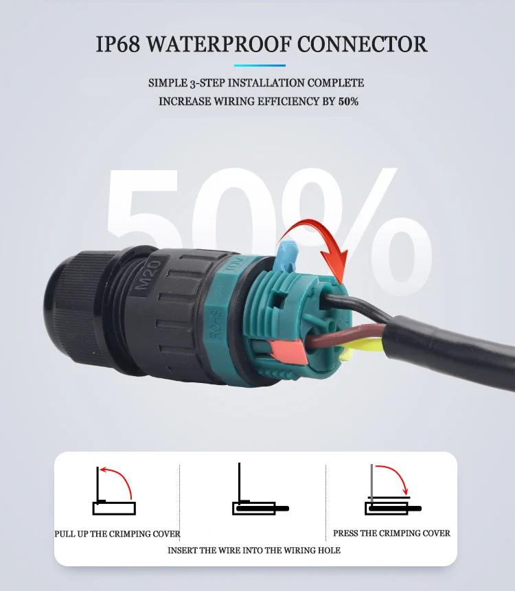 Особенности продукта: простой 3-ступенчатое установка завершена, инновационный пресс-на терминал, повышение эффективности проводки, 50%