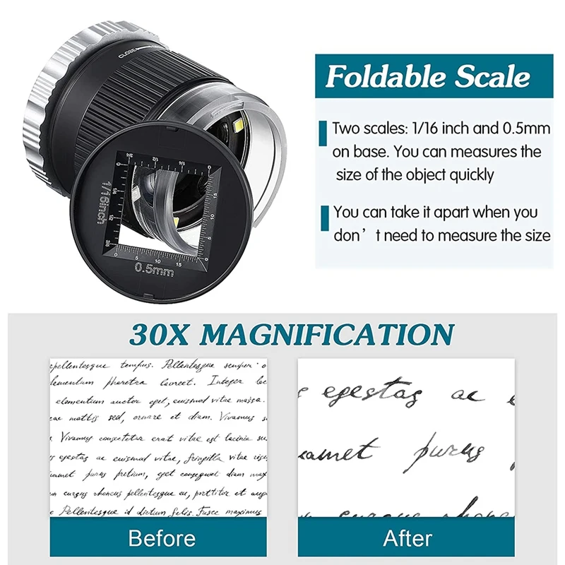 Регулируемое Фокусное расстояние: увеличительное стекло с регулируемым фокусным расстоянием фиксируется, однако вы можете настроить фокус, чтобы увидеть трехмерные объекты более четкими. Вы можете регулировать фокусное расстояние до тех пор, пока выступающая часть не будет четко видна. На основании есть 2 размера (0,5 мм, 1/16 дюймов) для измерения деталей. Основание шкалы съемное, так что вы можете удалить его для лучшего и быстрого наблюдения.
