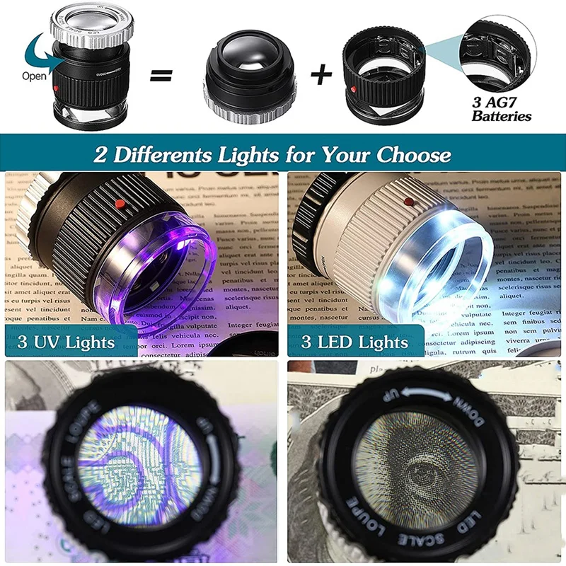 3 светодиодный и 3 УФ лампы: Этот увеличительное стекло с 3 режимами белого светодиодный свет и 3 ультрафиолетовые лучи. Яркий светодиодный светильник подходит для использования в темноте или для четкого просмотра деталей. УФ-лампы могут проверять валюту или видеть красочные объекты. Просто нажмите красную кнопку сбоку, и вы можете включить 3 белых фонаря. Нажмите второй раз, чтобы включить 3 УФ-лампы. Нажмите в третий раз, чтобы выключить светильник.