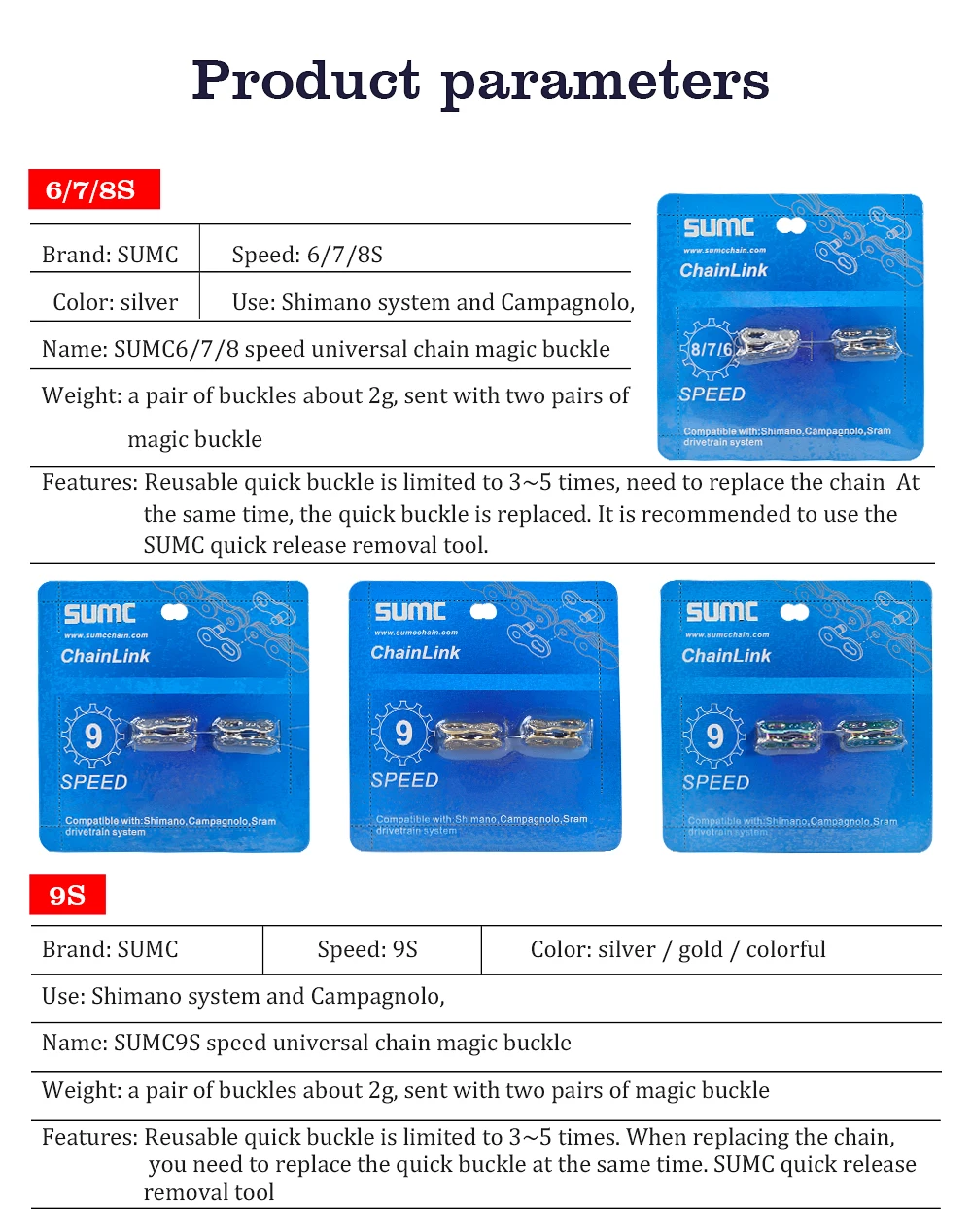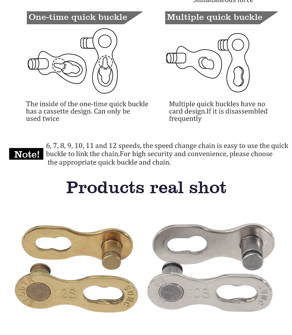 Характеристики: рекомендуется использовать его с быстросъемными инструментами. Быструю пряжку можно использовать повторно, ограничено 3-5 раз. При замене цепи необходимо заменить быструю пряжку.