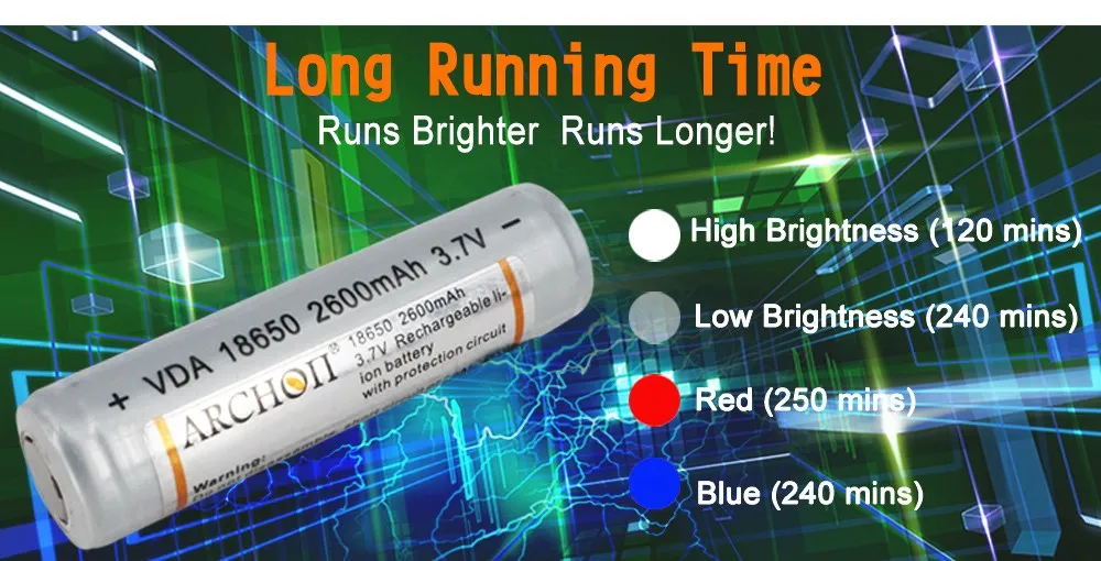 Примечание: Приведенные выше данные основаны на лабораторном тесте в методе тестирования ANSI/NEMA FL1, с использованием литий-ионного аккумулятора ARCHON, тест с использованием различных enviornment может привести к различным результатам