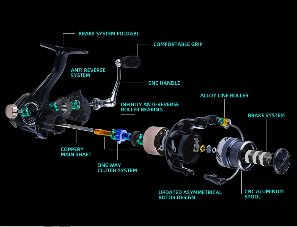 1.Light & Power Technology: Ultra-thin Body Design and CNC Machined Aluminum Spool is ideal for long time fishing.