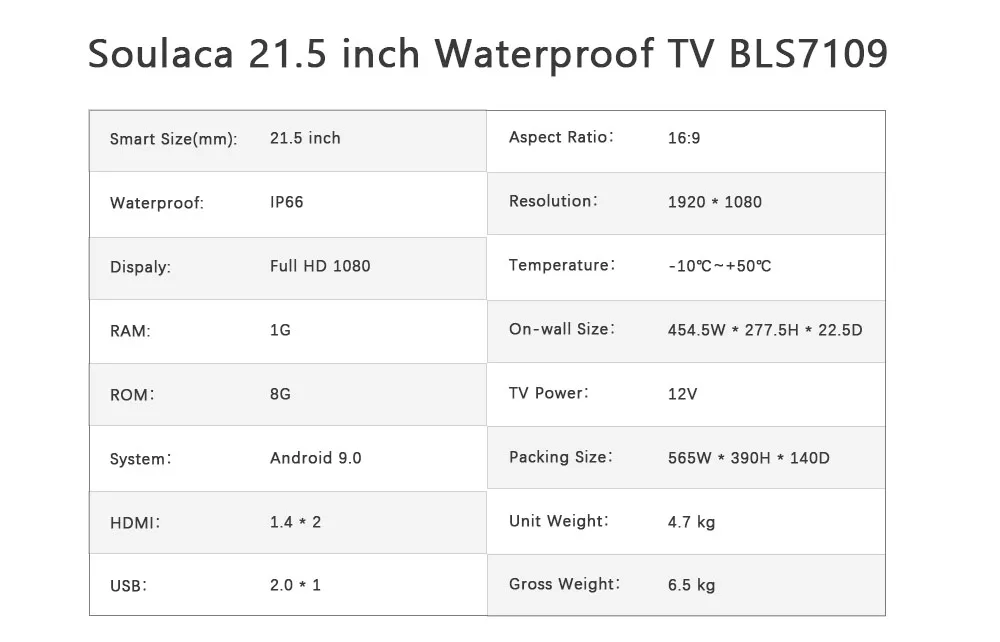 Со встроенным WiFi, технологией Smart TV и Full HD 1080p, водонепроницаемый смарт-телевизор обеспечивает изображение с высоким разрешением, а также позволяет просматривать веб-сайты или получать доступ к смарт-приложениям, чтобы легко найти ваши любимые медиа.