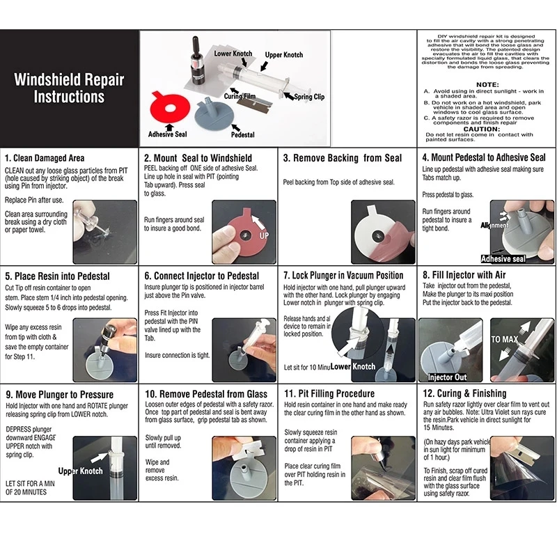 Набор для Ремонта Лобового стекла DIY предназначен для заполнения воздушной полости сильным проникающим клеем, который скрепляет свободное стекло и восстановит видимость.