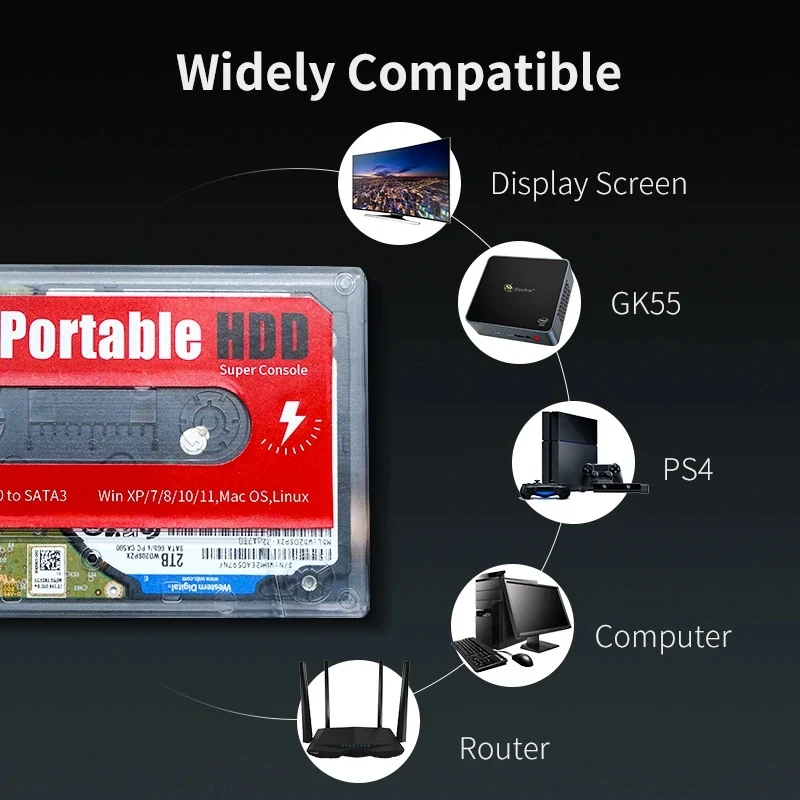 Жесткий диск большой емкости, широкая совместимость. Совместимость с Windows, Mac Os, Linux операционными системами, подходящими для ПК, ноутбуков и т. д., что позволяет превратить ваш компьютер в ретро-игровую консоль, подключи и играй, прост в эксплуатации