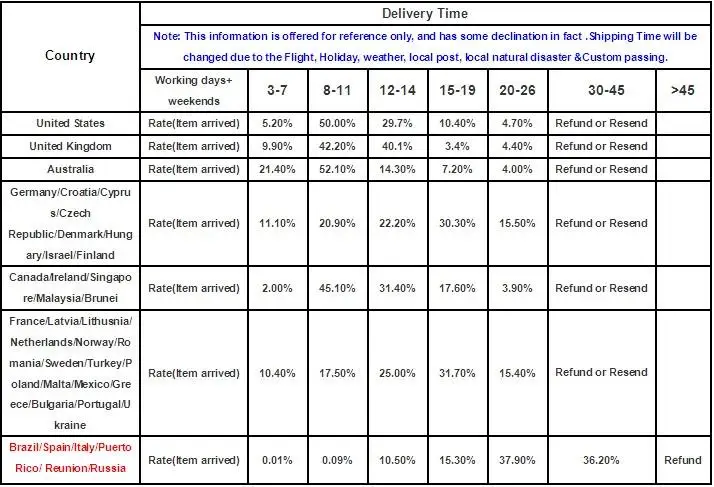 Товар отправляется в течение 5 рабочих дней после полной оплаты. Если вы не можете получить свой товар вовремя, пожалуйста, сначала свяжитесь с нами, мы проверим и решим его для вас в ближайшее время. Мы ответим на вашу почту в течение 24 часов. Иногда возникают небольшие задержки из-за выходных или праздничных дней. Если вы не можете получить нашу почту через 48 часов, пожалуйста, проверьте свой спам или свяжитесь с нами по другому адресу электронной почты.