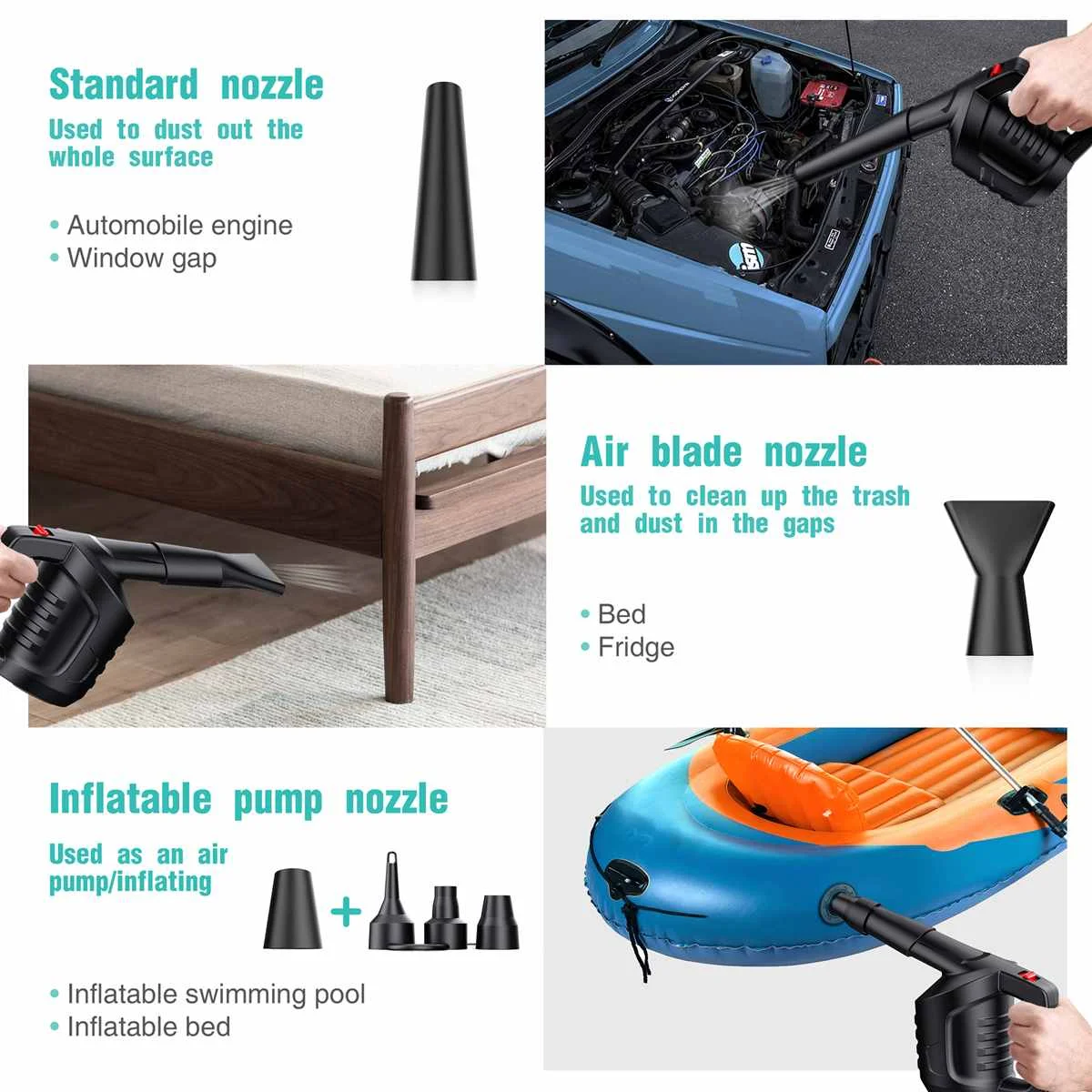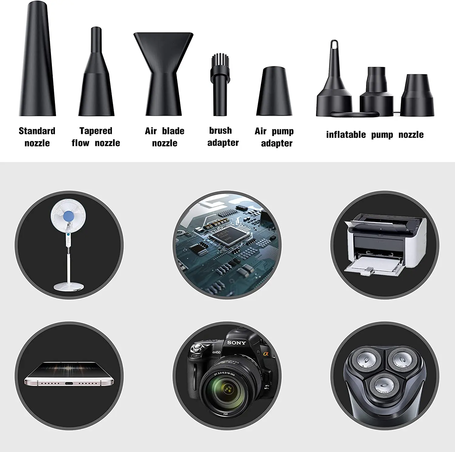 【 Мульти-use】WIth 8 дополнительное сопло насадки, что делает его легко маневренный универсальное устройство. Он используется для любого из ваших дорогих электронных устройств, таких как компьютер, клавиатура, ноутбук, копировальная машина, медицинское оборудование, камера и т. д.