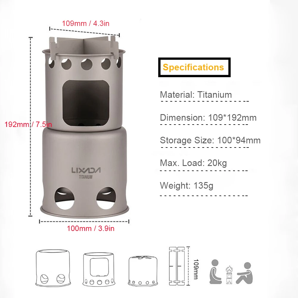 Этот Кемпинг печи сделана с титановая конструкция, которая является невероятно прочный и легкий. Это складывается в компактный размер для удобного хранения и транспортировки, отличный выбор для тех, кто любит мероприятий на свежем воздухе, как кемпинга, пешего туризма, альпинизма и т. д.