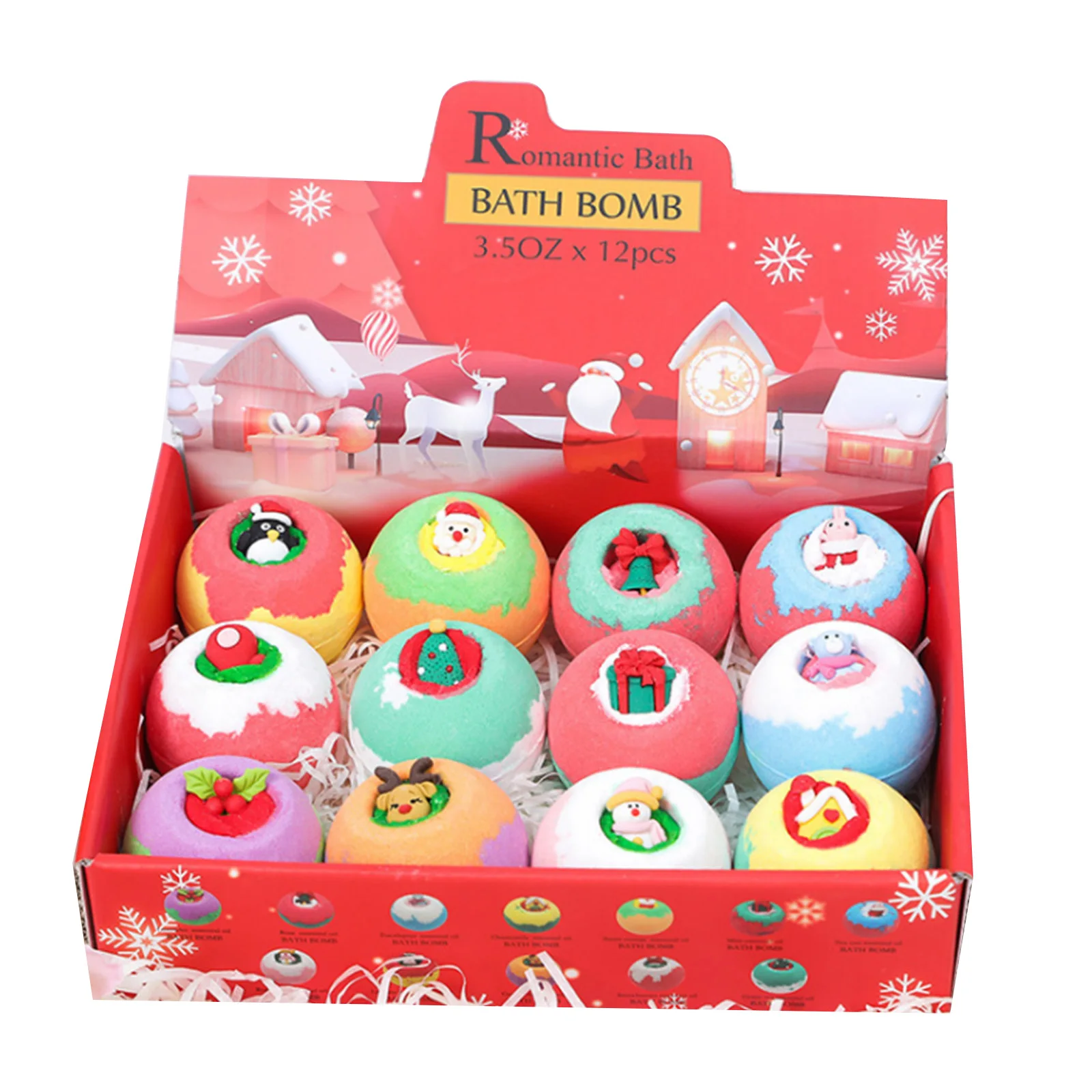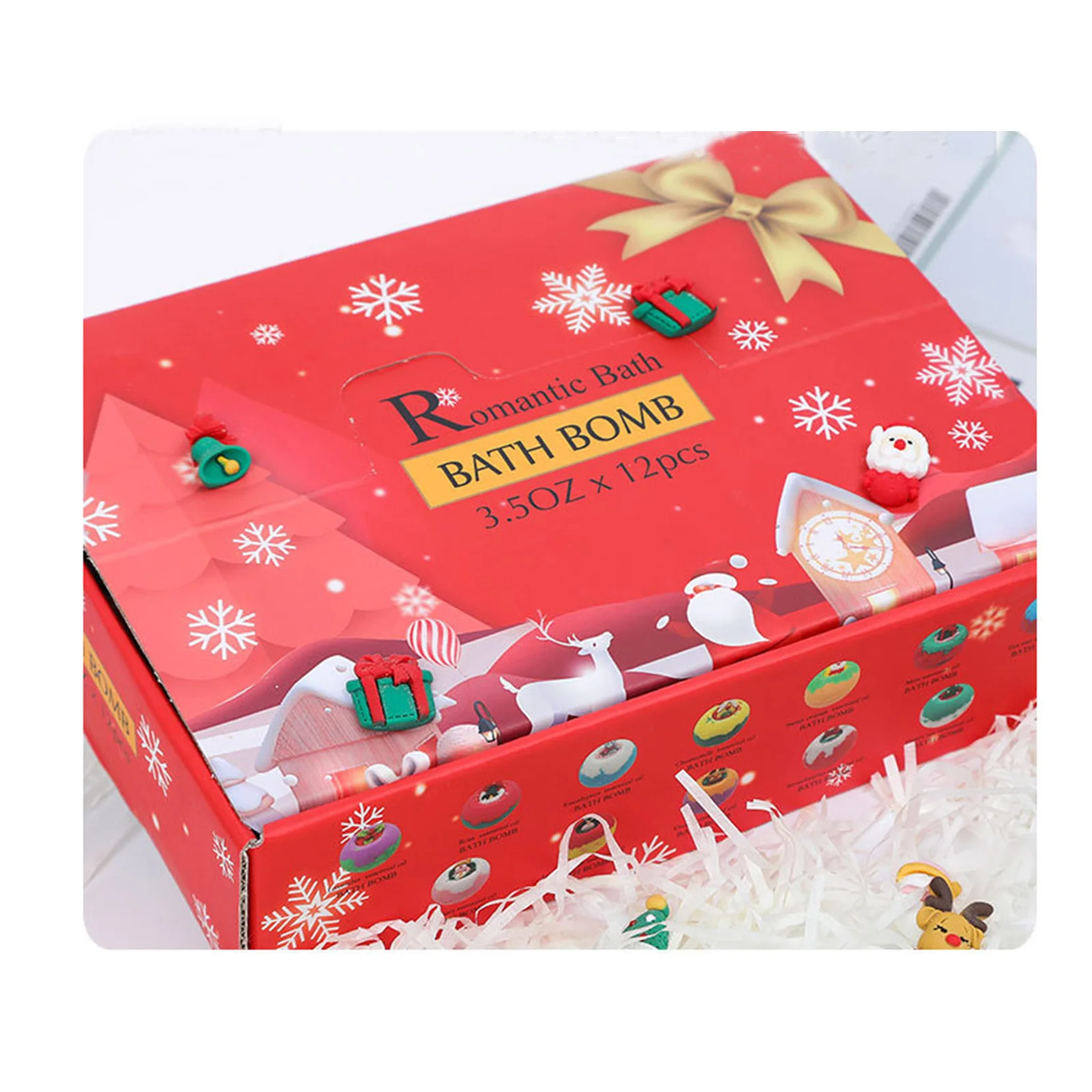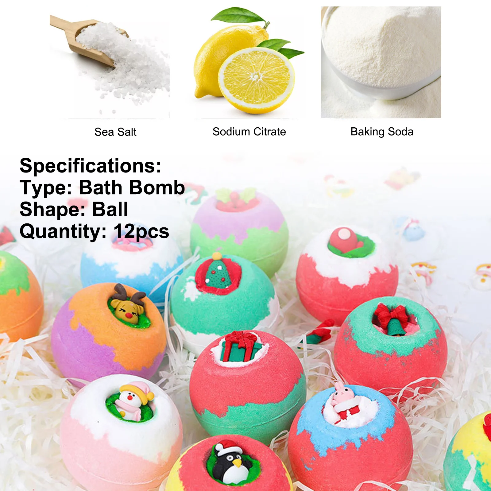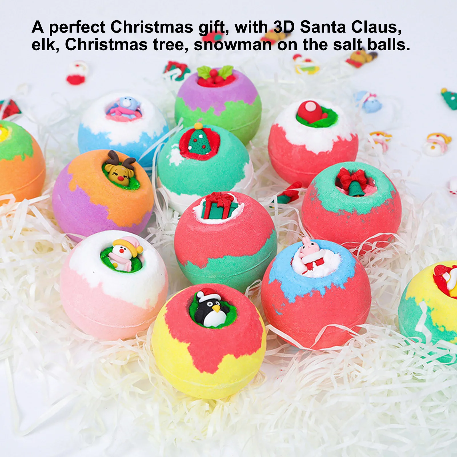 Изысканный дизайн: Каждый шарик для соли для ванны изысканно предназначен для рождества, вы можете видеть, что каждый шарик для соли для ванны имеет небольшой Рождественский узор, такой как Санта-Клаус, снеговик, лося и так далее.