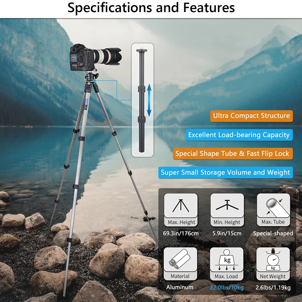Этот штатив изготовлен из авиационного алюминиевого сплава. Основной корпус штатива камеры имеет самую стабильную неколонную структуру с супер стабильностью, а максимальная грузоподъемность составляет 22 фунта/10 кг.