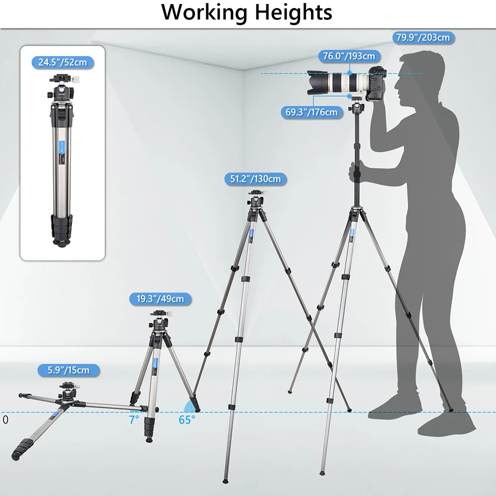 Максимальная высота 79,9 "/203 см. Этот штатив можно регулировать рабочая высота от 5,9" / 15 см до 79,9 "/203 см. Легко регулируется по высоте и подходит для различных потребностей съемки.