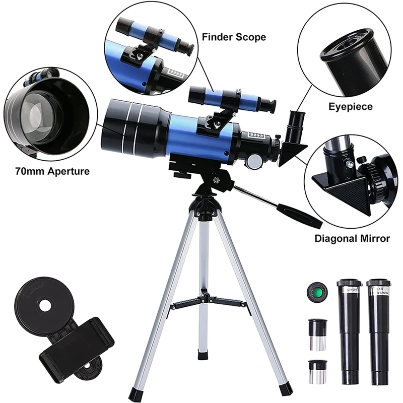 Телескоп для взрослых и детей, 70 мм апертура (15X-150X) Портативный рефрактор Телескопы для начинающих, 300 мм Дорожный телескоп