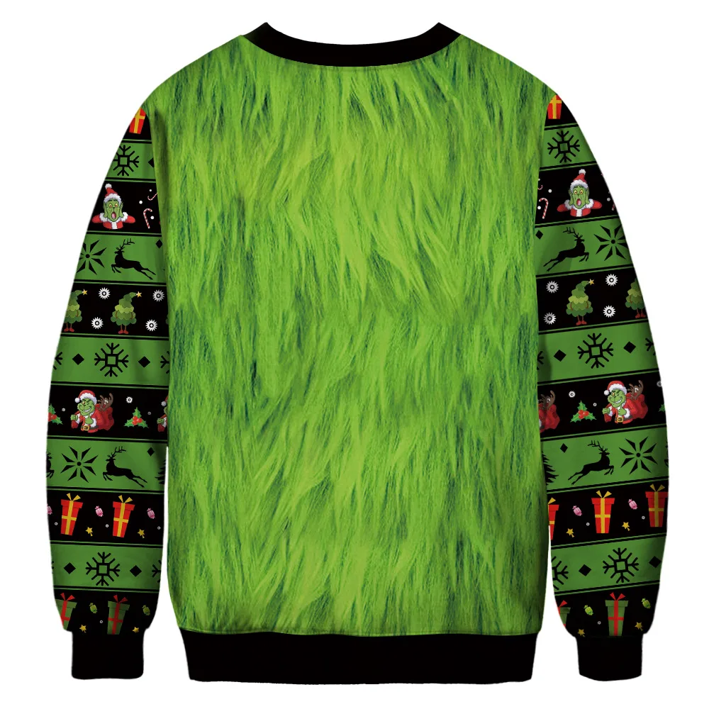 Новый зеленый пуловер с принтом монстра из меха с круглым вырезом и длинными рукавами для мужчин и женщин