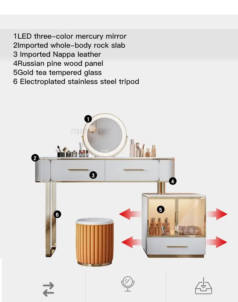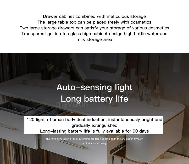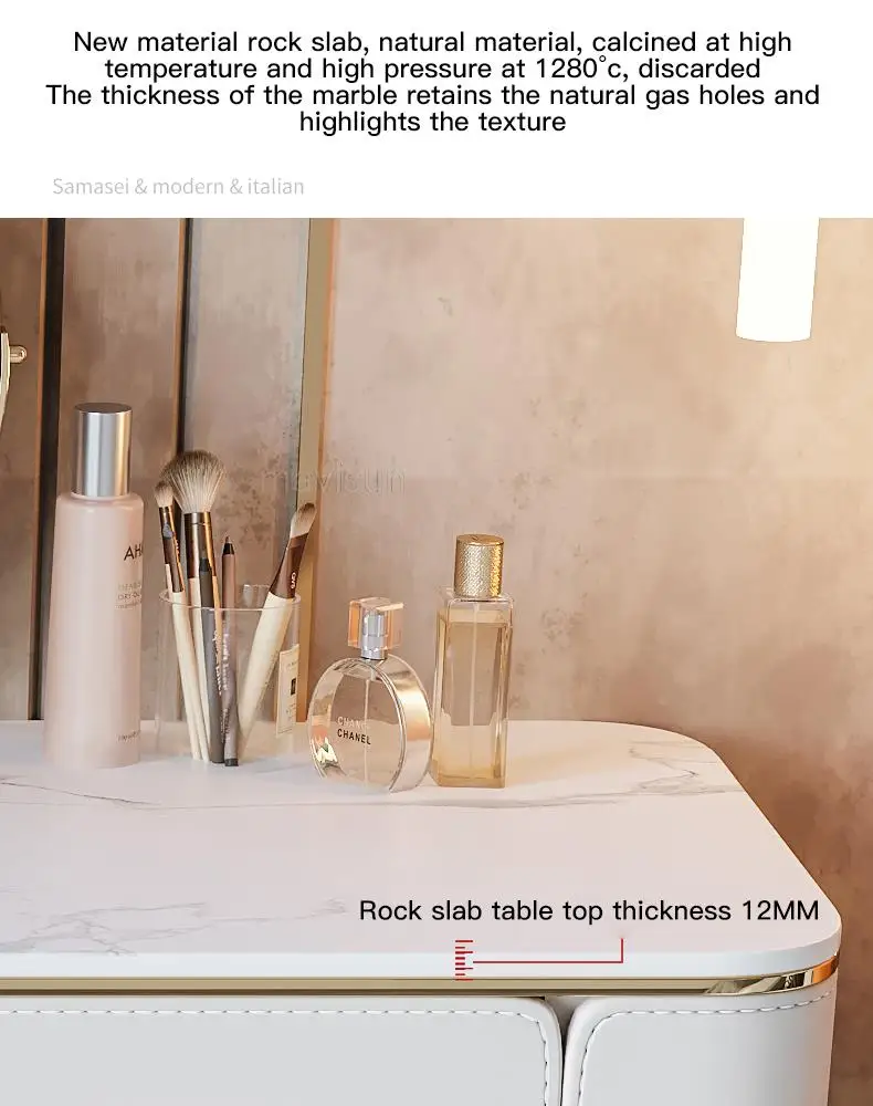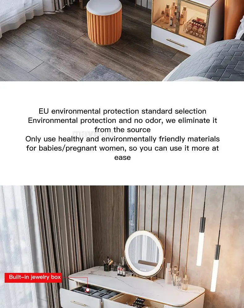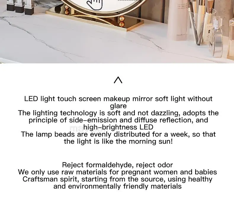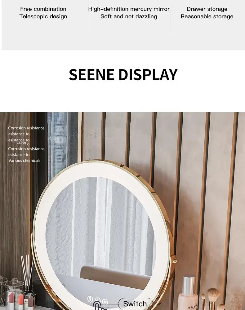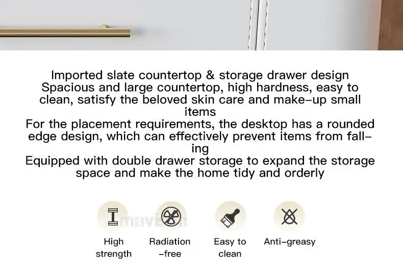 D.Продукт разработан с ящиком для хранения, просторной и большой столешницей, высокой твердостью и легко чистится, чтобы удовлетворить потребности размещения любимых средств по уходу за кожей и макияжу.