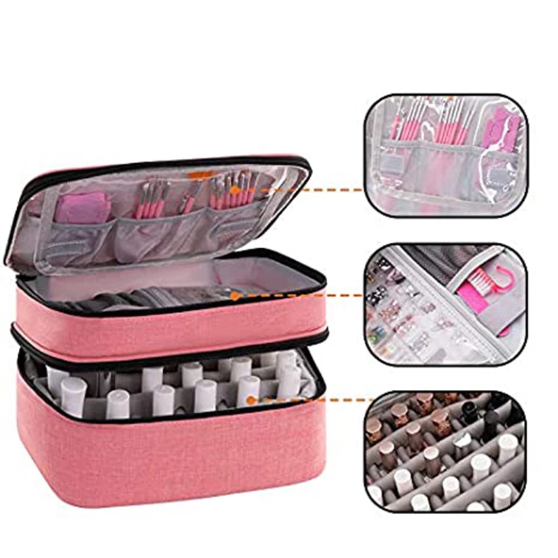 4. Store Nail Polish Accessories: There are 3 elastic pockets in the top compartment for storing brush, nail file, cuticle remover, etc. The additional visible flap prevents the nail accessory from falling off. The compartment with a transparent zipper pocket at the bottom provides enough space for other nail polish accessories.