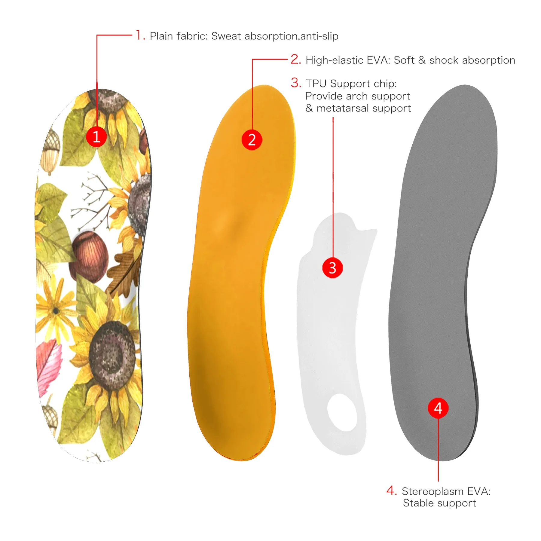 --- Амортизирующие слои: Есть два слоя с высокой плотностью и высокой амортизирующей ЭВА, которые могут ускорить скорость отскока и поглощения ударов, помочь улучшить физические упражнения или ходить, И не легко повредить.