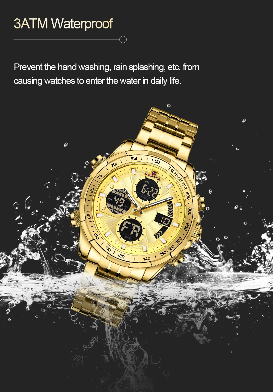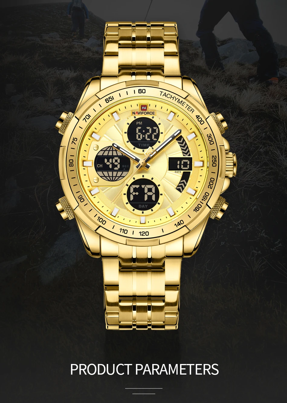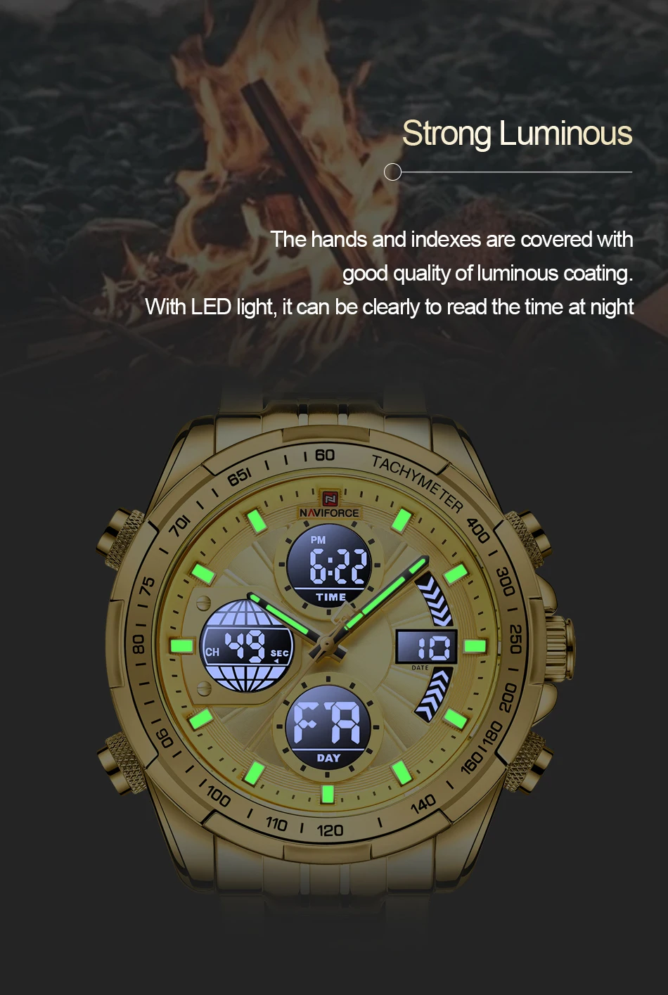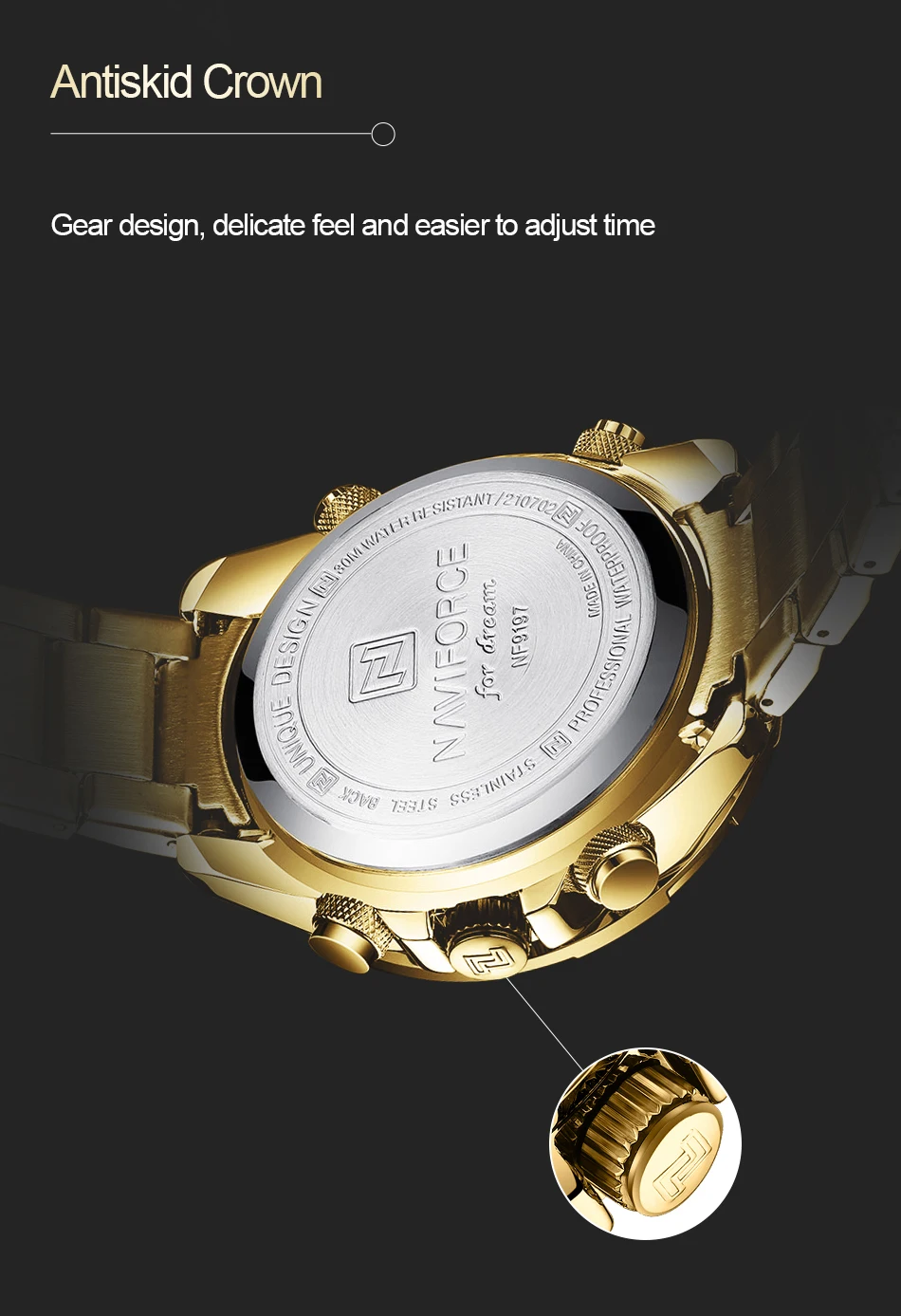 NAVIFORCE мужские Кварцевые Золотые часы Лидирующий бренд мужские спортивные водонепроницаемые наручные часы с хронографом из нержавеющей стали Кварцевые часы мужские часыОписание продукта: