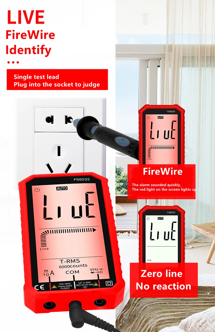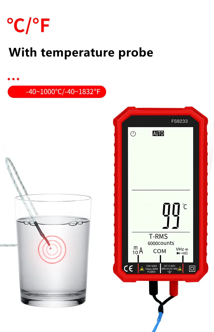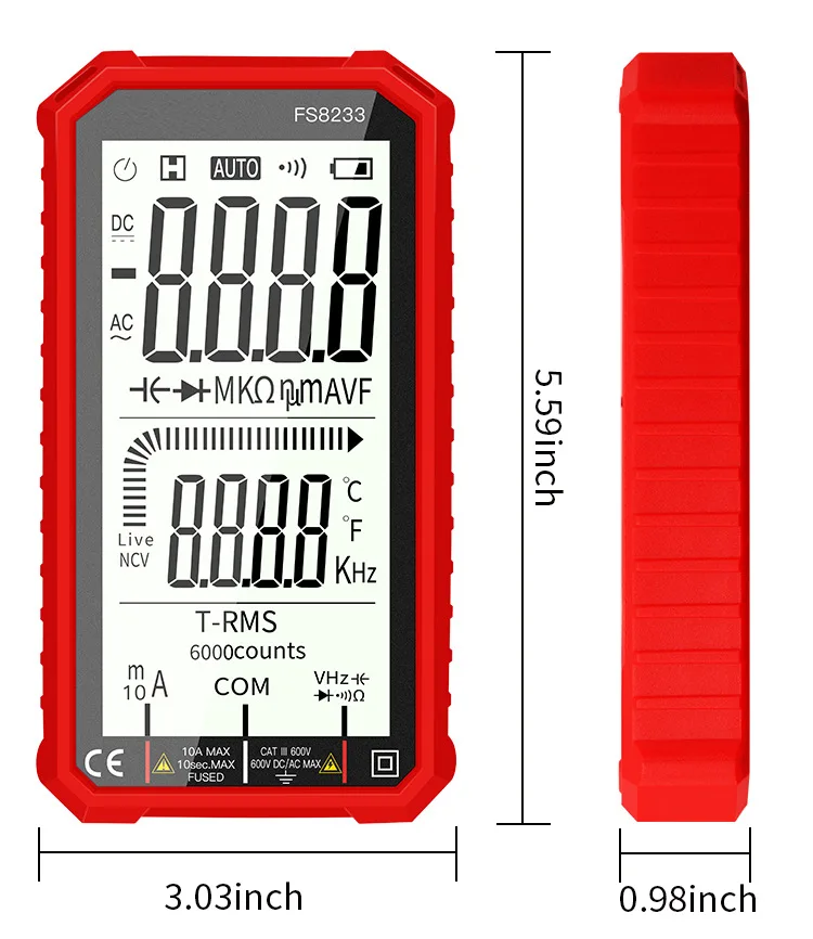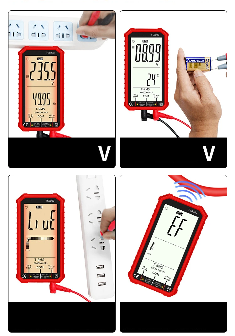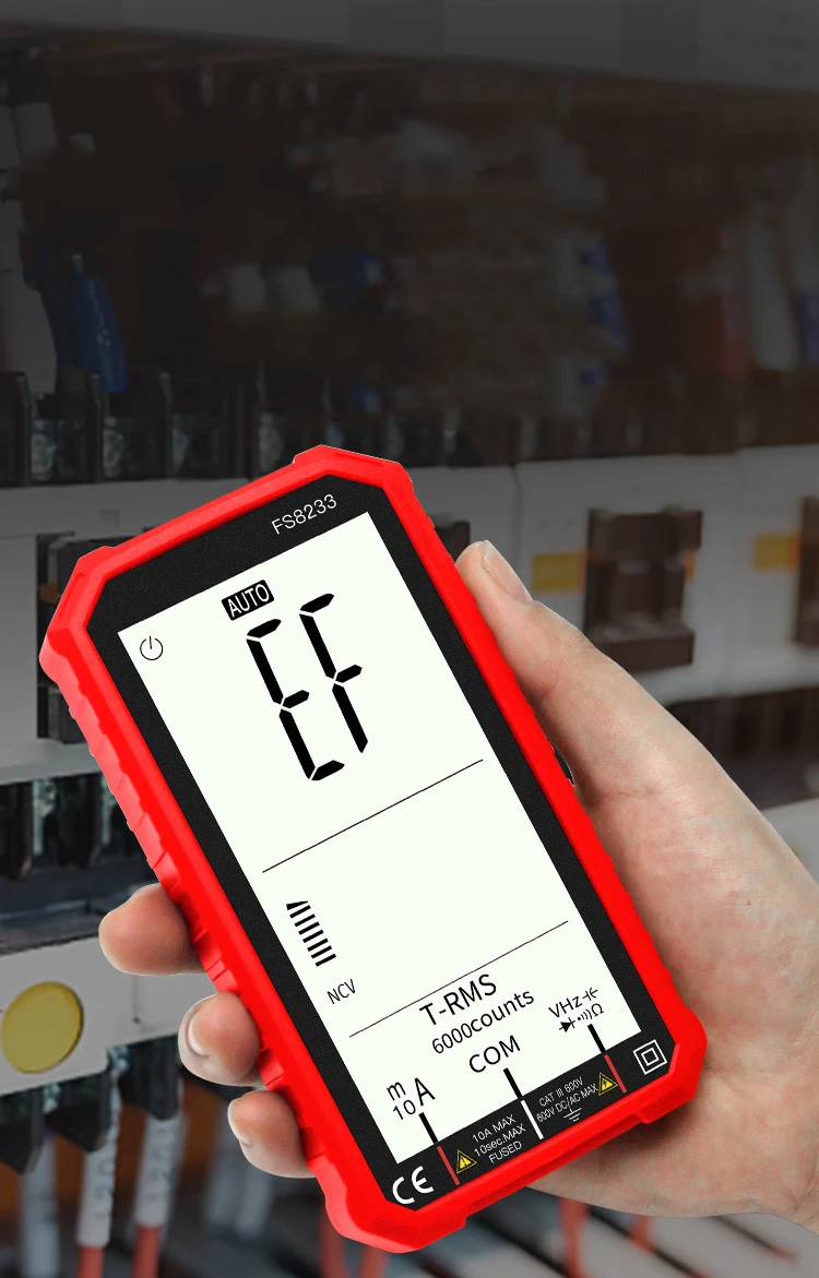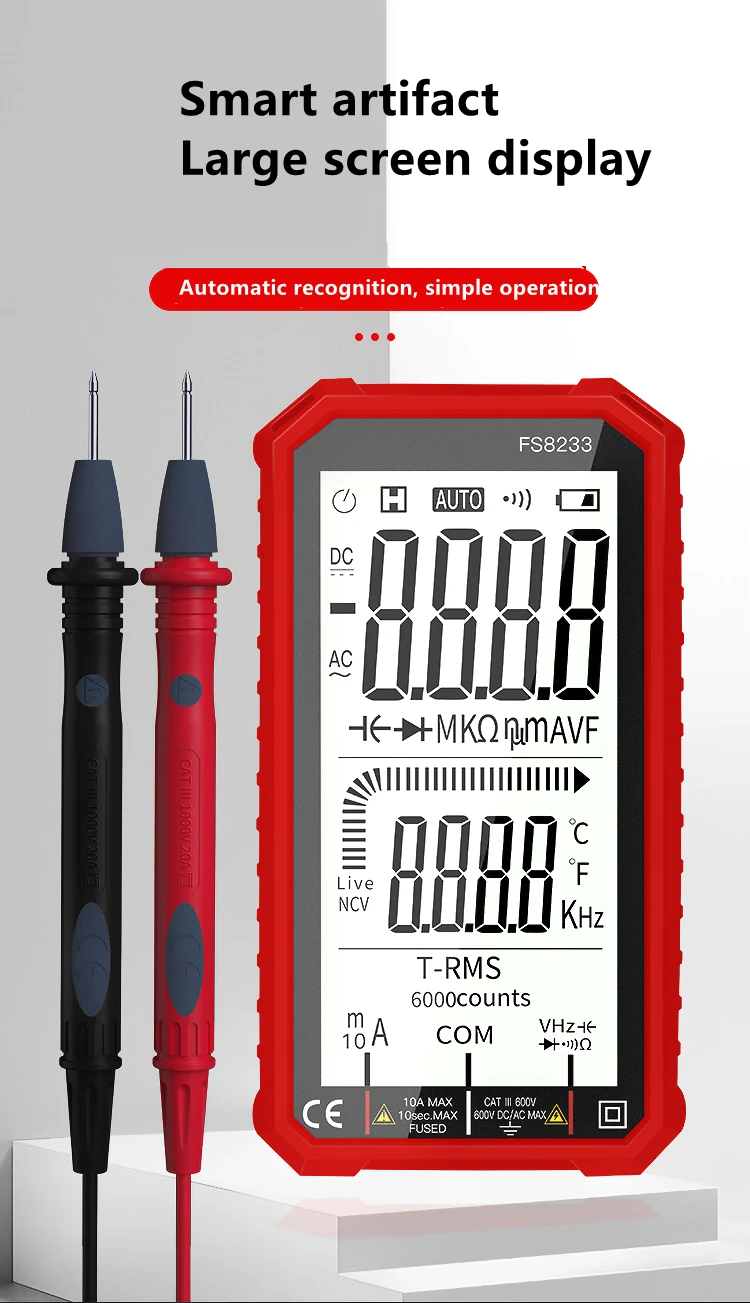 В FS8233 Смарт мультиметр отличается размером с ладонь, большой 4,7 дюйма ЖК-дисплей дисплей, с автоматическим выбором диапазона, эффективное значение, защита от перегрузки, ударопрочный силиконовый рукав и звуковой бесконтактная проверка напряжения переменного сигнала тревоги. Он очень портативный и подходит для обслуживания автомобилей, электронных продуктов, бытовой техники, ОВКВ и т. д.