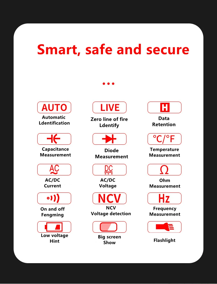 Мультиметр: измеряет ток переменного/постоянного тока, напряжение переменного/постоянного тока, Бесконтактное Обнаружение напряжения переменного тока (NCV), живое/нейтральное обнаружение, сопротивление, диод, емкость, температуру и частоту.