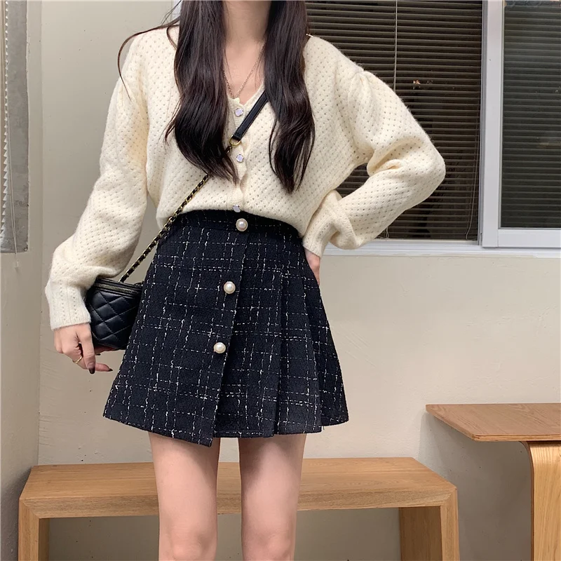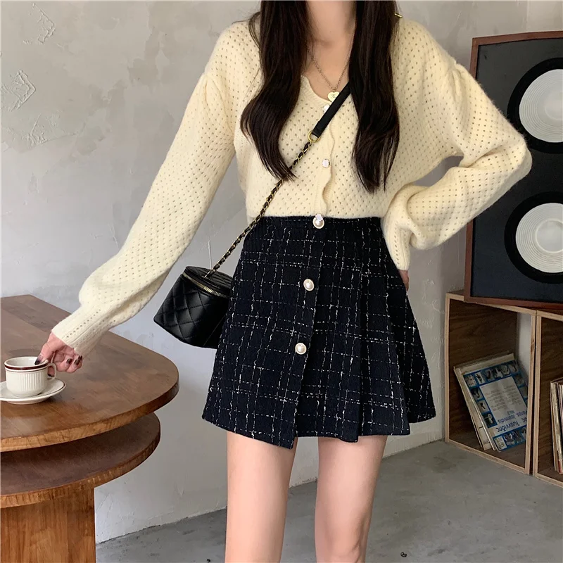 Осенняя клетчатая твидовая юбка, Женская винтажная элегантная юбка больших размеров, шерстяная плиссированная Офисная Женская Зимняя юбка-шорты черного цвета M446