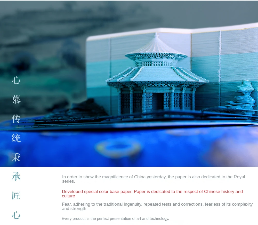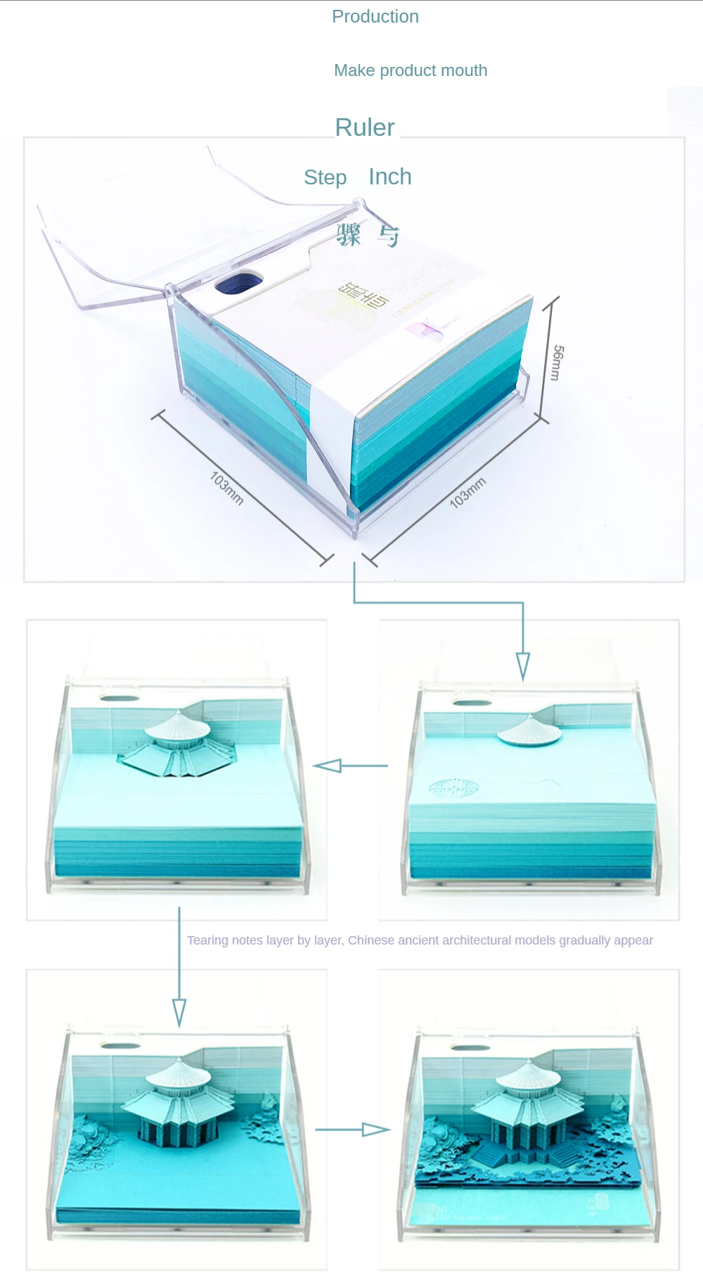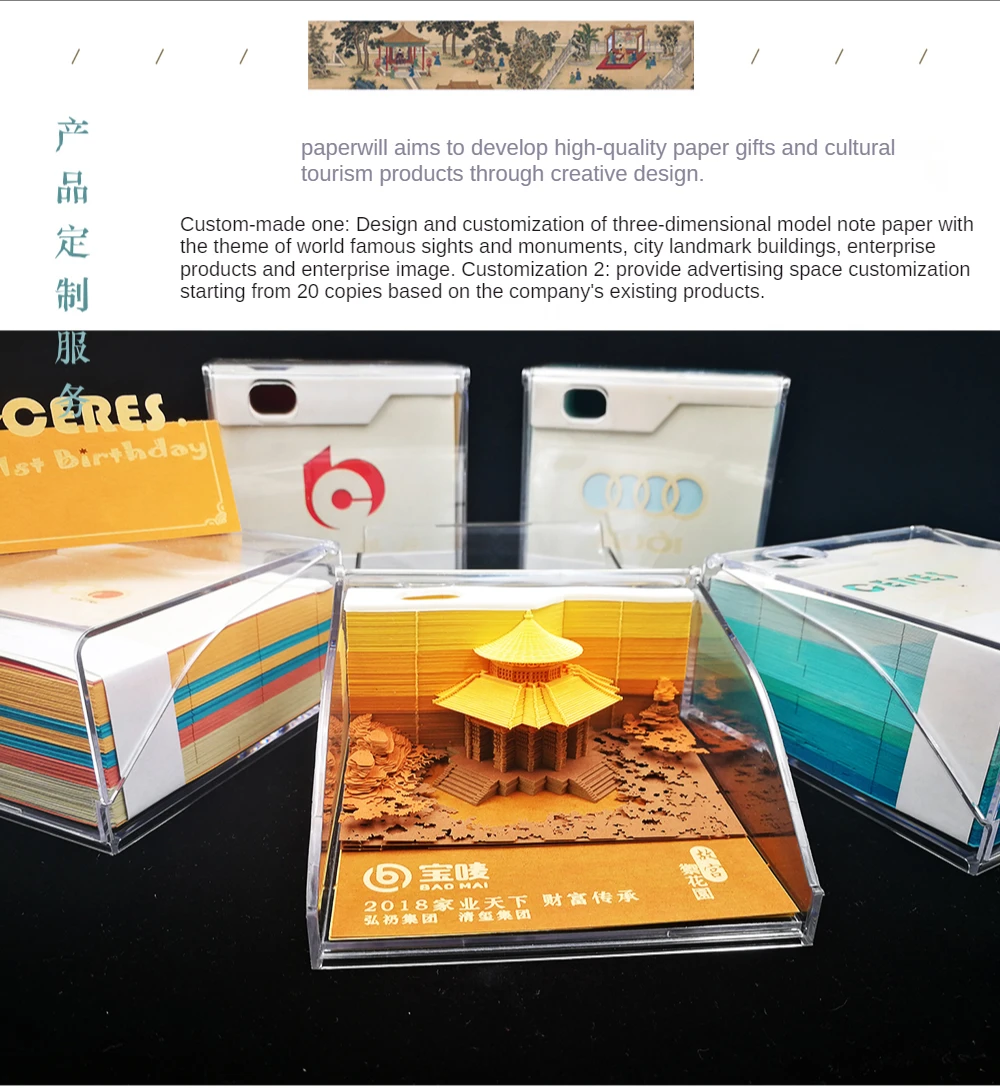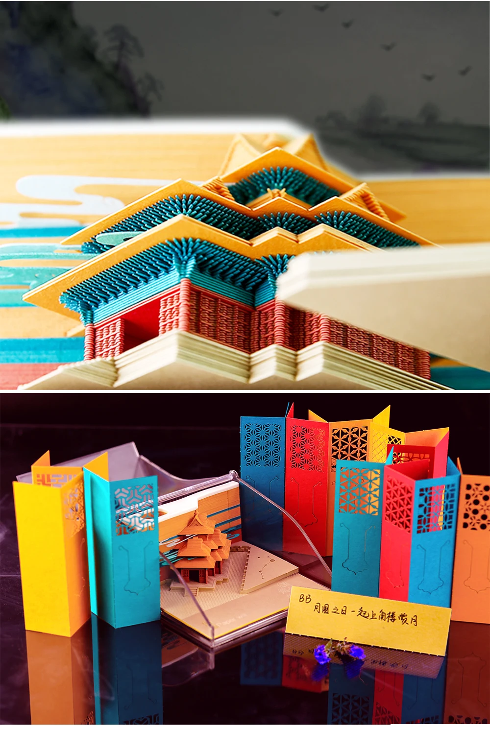 Это так красиво, что это Взрывная 3D Бумага для резьбы. Самая большая изюминка: поскольку бумага для заметок оторвана, постепенно появляется Скрытая резьба по бумаге. После разрыва последнего, там будет красивая бумажная скульптура, в том числе Известные здания, пианино, автомобили, Токийская башня, Великая стена, башни, арочные павильоны, Chihiro суповый дом, qingshui храм, желтый кран башня и т. Д.