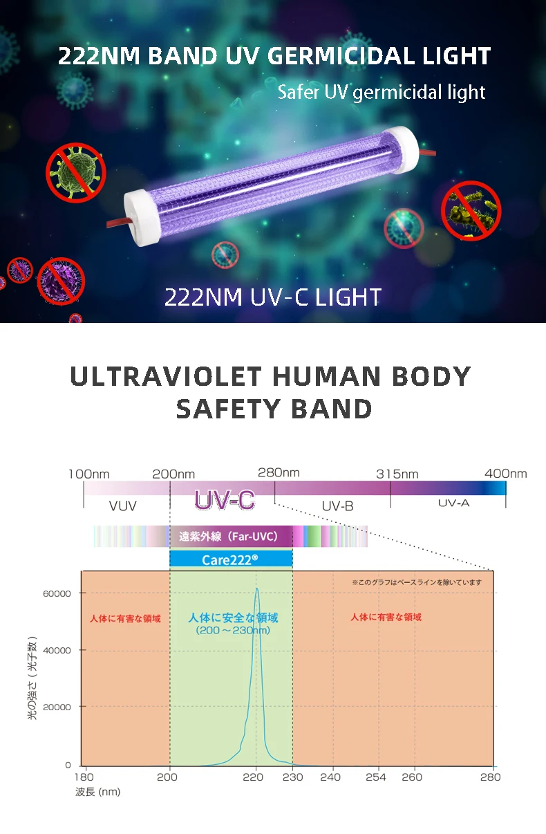 207 ~ 222nm excimer far UVC были анонсированы безопасными УФ-лампами без вреда для людей или животных и с сильным вирусом убивает способность.