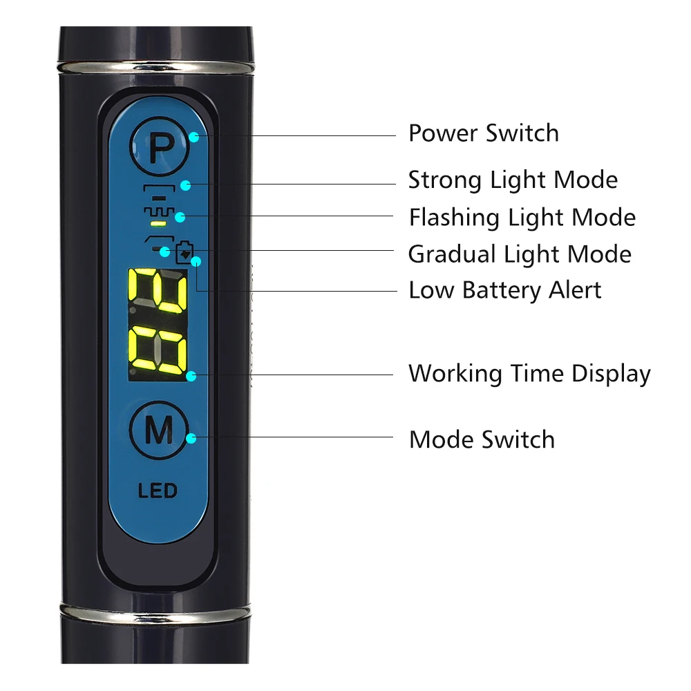 6) Интеллектуальная функция обнаружения батареи: Когда батарея низкая, она будет оповещать, и светильник будет мигать.