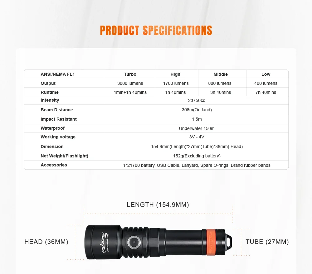 Независимо от того, являетесь ли вы отдыхающим или профессиональным дайвером, Вы найдете погружной светильник ORCATORCH D710, полезный для подводной деятельности. С макс 3000 люмен, D710 является одной из самых мощных горелки в своем классе. Но у вас есть много настроек яркости на выбор, если вы предпочитаете меньше энергии. Он работает на одной перезаряжаемой батарее OrcaTorch 21700 5000 мАч с зарядным портом Type-C, легче для вас заряжать его в любом месте.