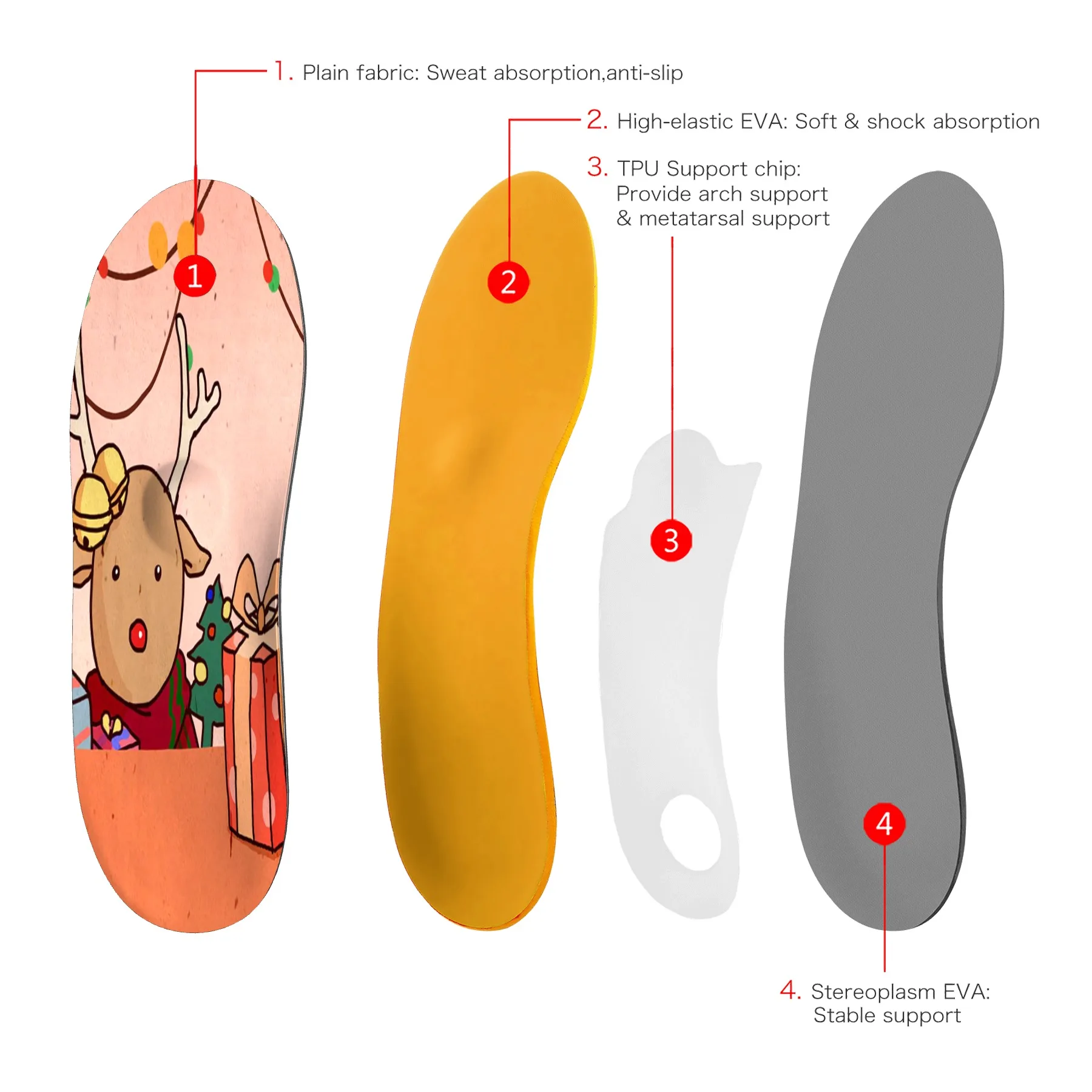 --- Амортизирующие слои: Есть два высокоплотных и высоковспенивающихся амортизирующих слоя EVA, которые могут ускорить скорость отскока и поглощения ударов, помочь улучшить физические упражнения или ходить, И не легко повредить.