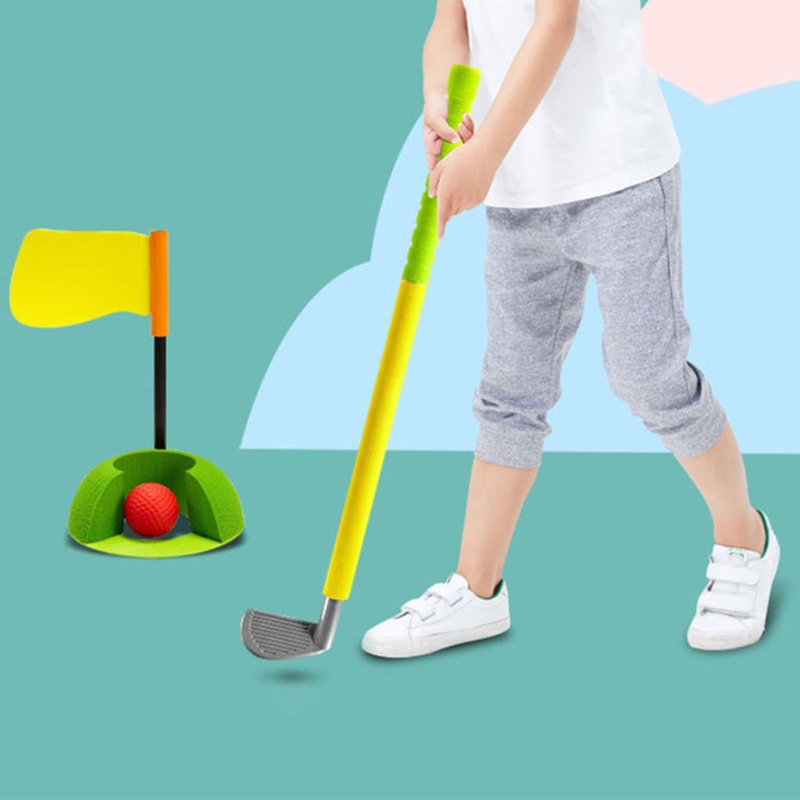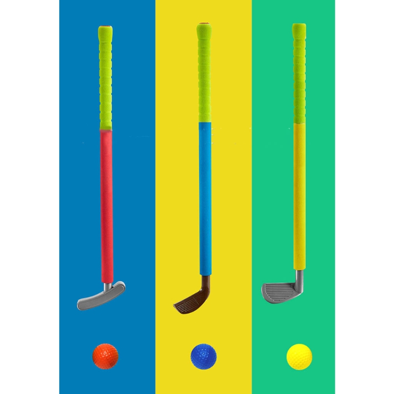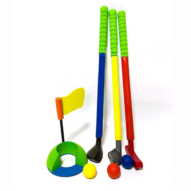 Этот набор детских игрушек для гольфа включает 3 гольф-клуба, 3 мяча для гольфа, 1 отверстие, 1 флаг.