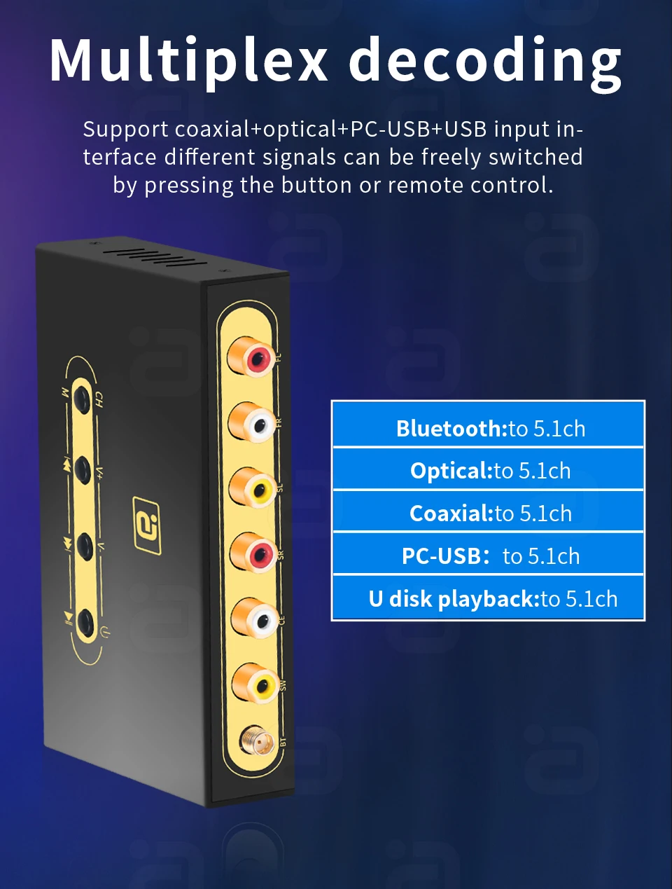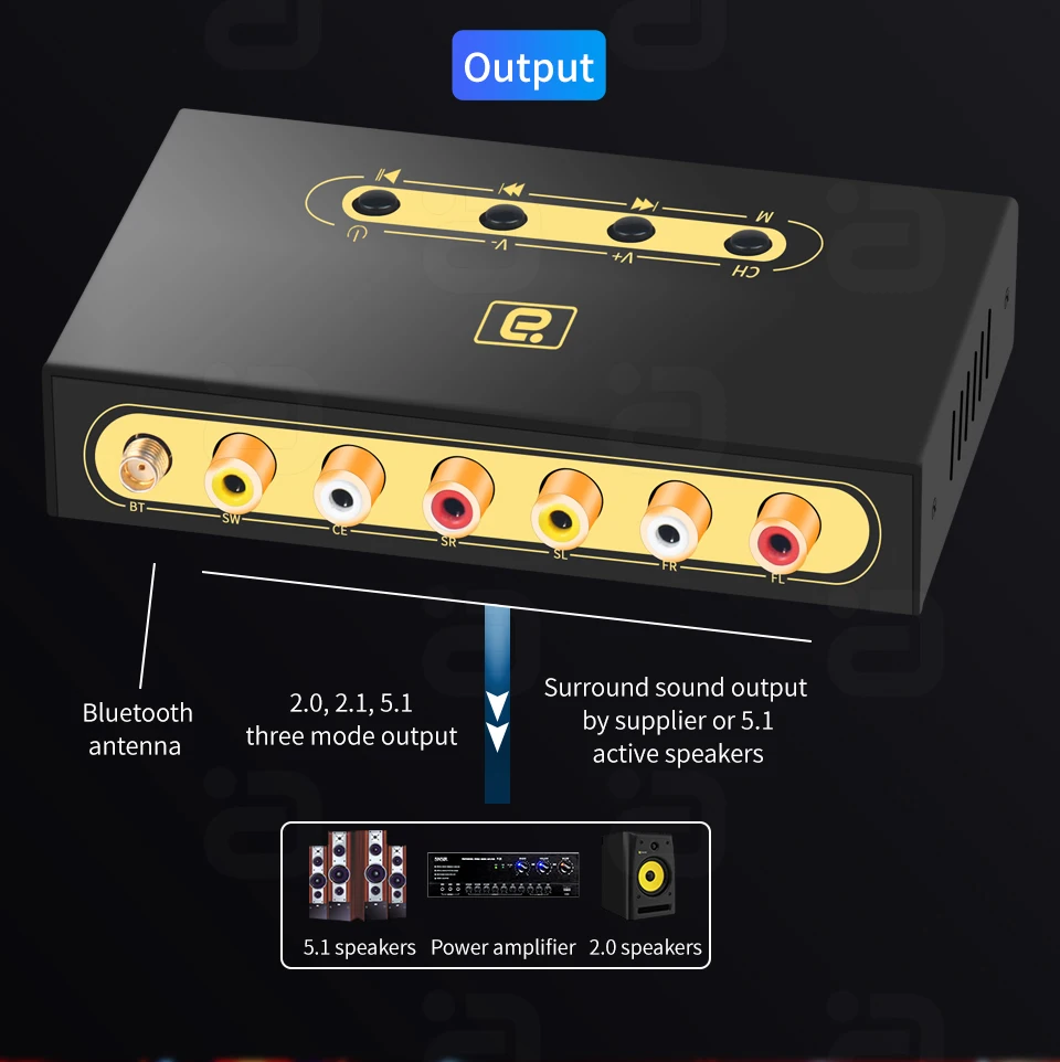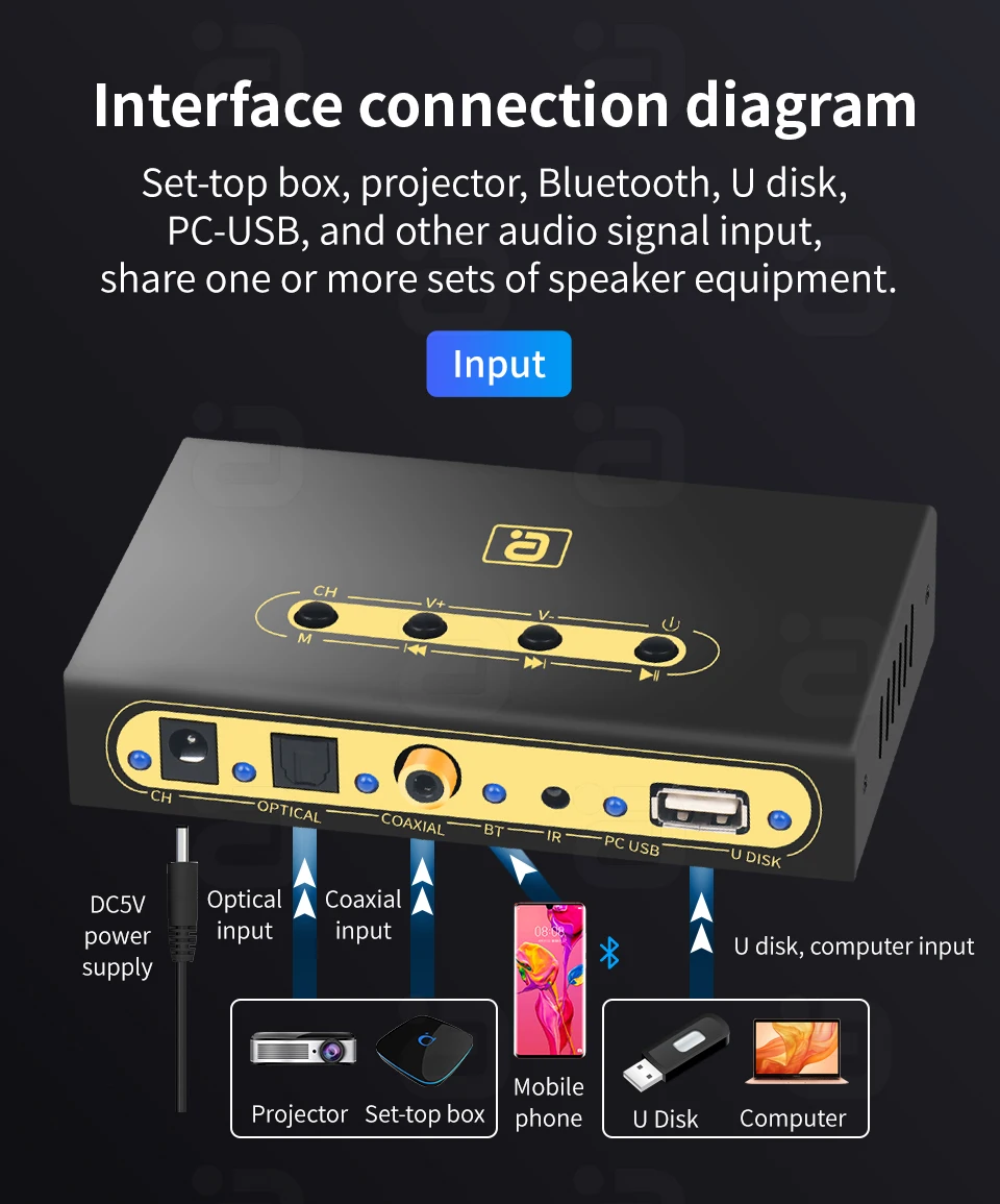 1. Поддерживает один оптический вход, один коаксиальный вход, вход Bluethooth 5,0, один вход USB 2,0, один вход PC-USB. Вы можете переключать различные источники сигнала в случайном порядке с помощью кнопки или пульта дистанционного управления