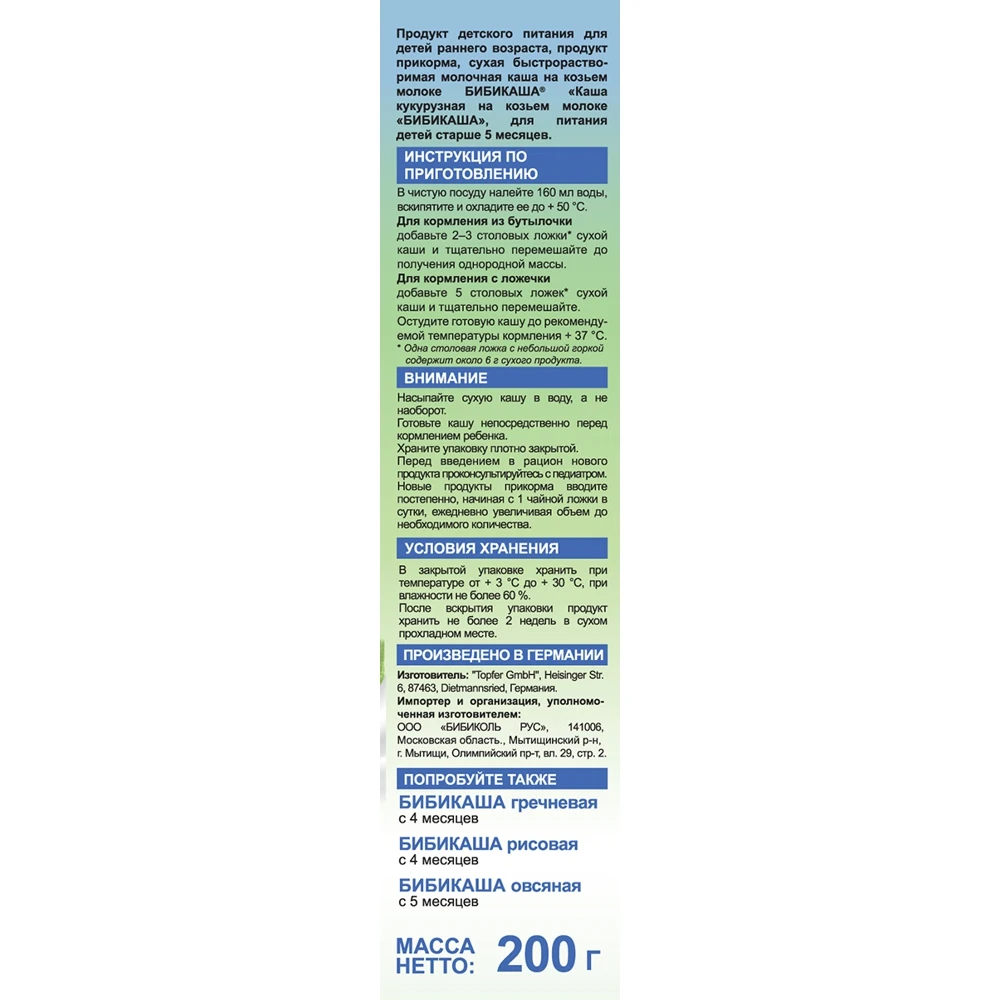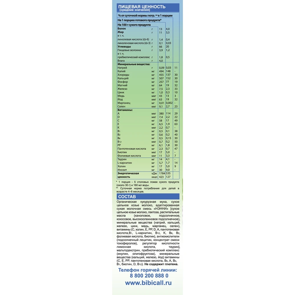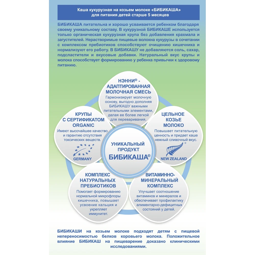 Bibikasha is nutritious and well absorbed by the child due to its unique composition. In corn bibicash only organic corn cereal is used without adding starch and thickeners. Insoluble food fibers of corn in combination with a complex of prebiotics contribute to the purification of the intestine and normalize its work. No salt, sugar, sweeteners and taste additives are added to the bibicash. The natural taste of cereals and milk contributes to the formation of a child's habit of healthy nutrition. Ingredients: organic corn flour, dry whole goat
