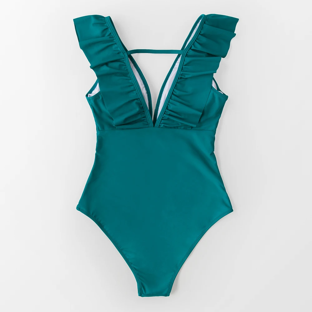 Почувствуйте теплый Океанский бриз в нашем бирюзовом слитном купальнике с оборками. Этот купальник идеально подходит для девушек, которые любят пляжную жизнь! С глубоким вырезом спереди и v-образным вырезом сзади с завязкой на талии. Гофрированные плечи для сладости.