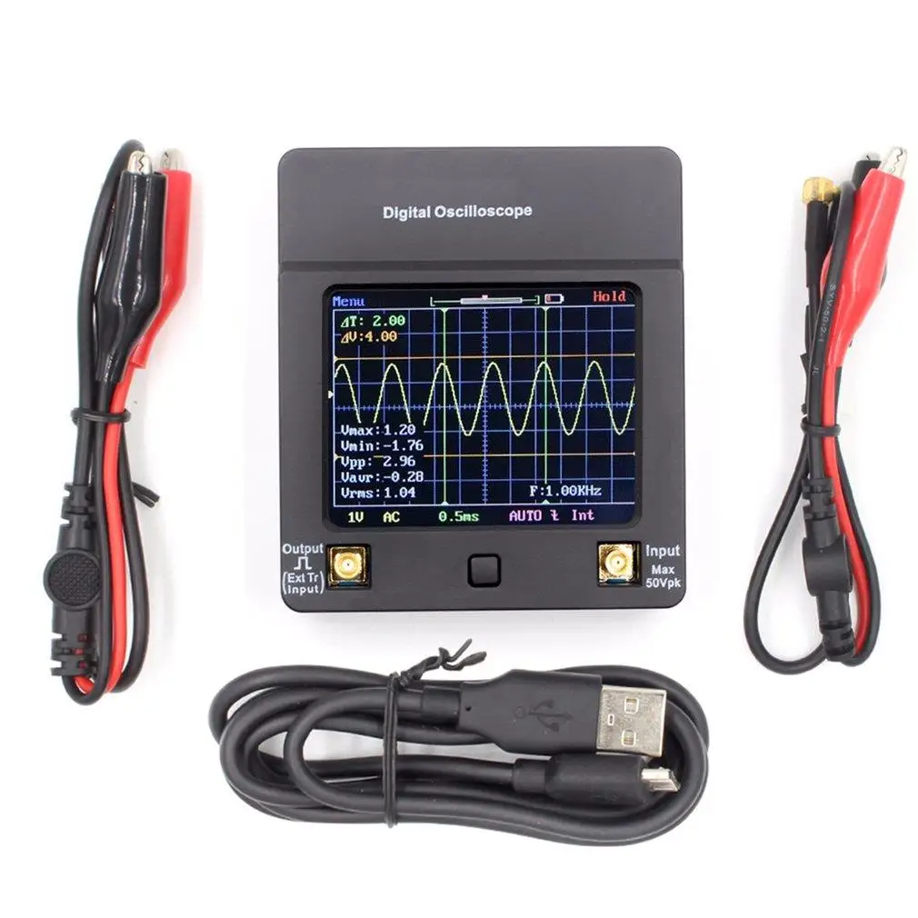 Особенности: 1. Карманный осциллограф с цветным дисплеем и сенсорной панелью. 2. Аналоговая полоса пропускания 2 МГц и максимальная частота дискретизации 5 Msps в реальном времени. 3. Уникальный скользящий дисплей медленного сигнала для полностью непрерывного сигнала (режим сканирования вызовет перебои отображения сигнала). 4. Вертикальная чувствительность: 2 мВ/див, с высокой точностью и низким шумом, сохраняет 24 группы заданных параметров, удобно сохраняет и запоминает сигнал. 5. Измерение частоты и Макс./мин./Vpp/Avg. Значения напряжения. 6. Добавляет функцию внешнего запуска, более высокую способность захвата сигнала 7. Персональные данные о загрузке сигналов. 8. Замораживание в любое время отображения формы волны (функция удержания). 9. Квадратный волновой тестовый сигнал приходит 1000 Гц/3,3 В. 10. Обновление прошивки через Micro USB. 11. Питание от аккумулятора/USB, встроенное умное зарядное устройство. Описание: 1. DSO112A-это отличный осциллограф входного уровня с размером, который подходит прямо в руке и кармане. 2. Высокая чувствительность (2МВ/див), высокая точность и низкие шумы являются основным моментом DSO112A и делают его полезным инструментом для небольшого зондирования сигнала. Характеристики: Модель:DSO112A Полоса пропускания аналоговой частоты: 0 - 2 МГц Макс. Частота дискретизации в реальном времени: 5 Msps Вертикальная чувствительность: 2 мВ/Div-20V/див, 12 класс s (путем прогрессивного 1-2-5) Горизонтальный диапазон времени: 1 мкс/Div-50s/див, 21 класс (путем прогрессивного 1-2-5) Макс. Входное напряжение: 50Vpk (100Vpp) Макс. Длина записи: 512/1024 опционально Входное сопротивление: 1 м ом Точность ADC: 8 бит Метод соединения: DC / AC Тип триггера: автоматический, нормальный, одиночный Кромка триггера: подъем/опускание Источник запуска: внутренний/внешний Напряжение внешнего триггера: 0-15 в Курсоры времени: Автоматическое вычисление и отображение разницы во времени Курсоры напряжения: автоматически рассчитать и отобразить разницу в напряжении Дисплей: цветной дисплей TFT Мощность питания: 3,7 V, 1200 мА/ч, литий-ионный аккумулятор (все указанные аккумуляторы входят в комплект поставки), USB Интерфейс Размеры: 68x78x18 мм (2,7x3,1x0,7 дюйма) Посылка включает в себя: 1 * осциллограф 1 * Датчик зажима осциллографа