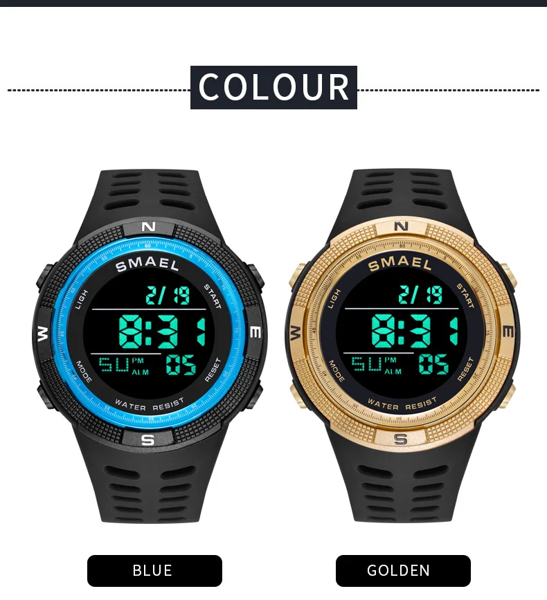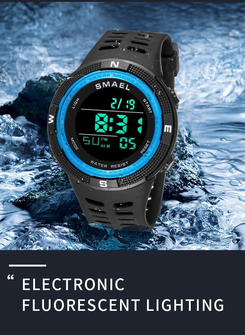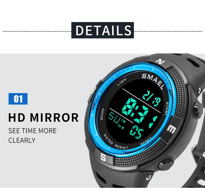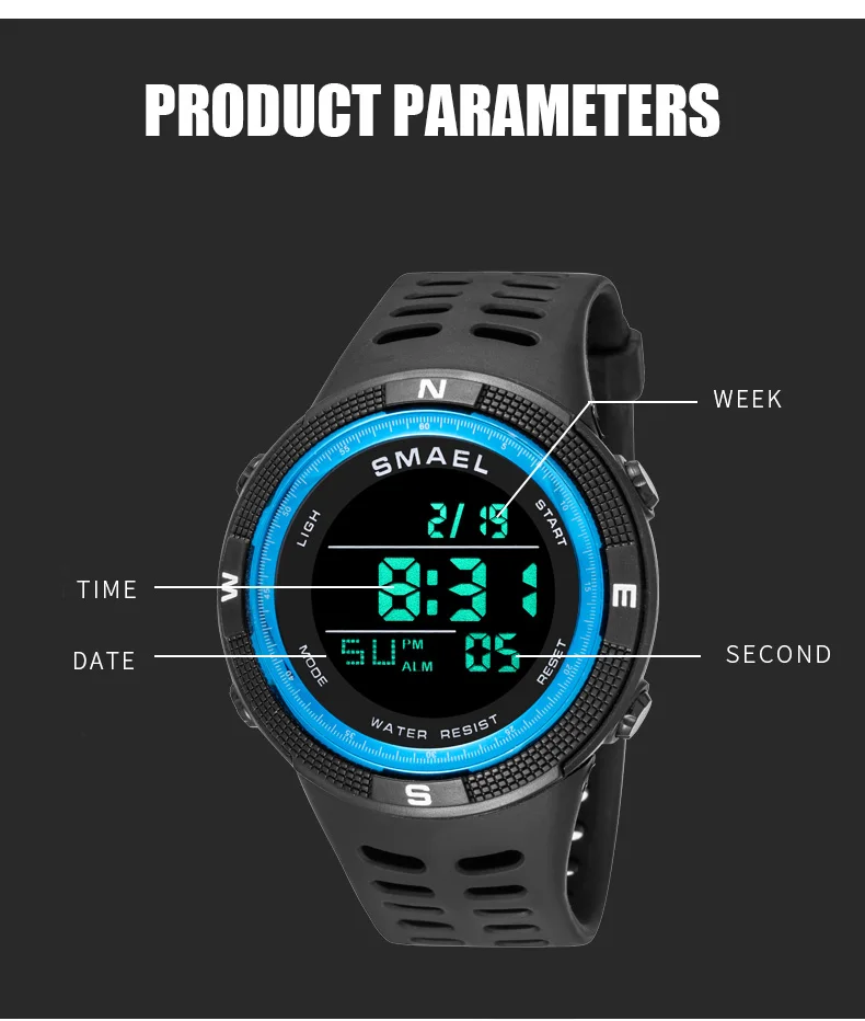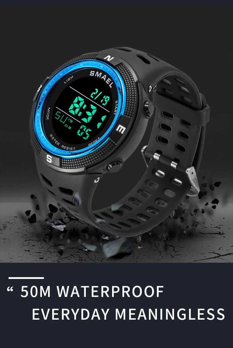50M water resistance, shock resistance, date-day,alarm clock and a 12/24 hours format.