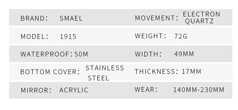 This SMAEL 1915 men’s watch features a durable 17mm x 49mm plastic case and a 230mm adjustable wristband.