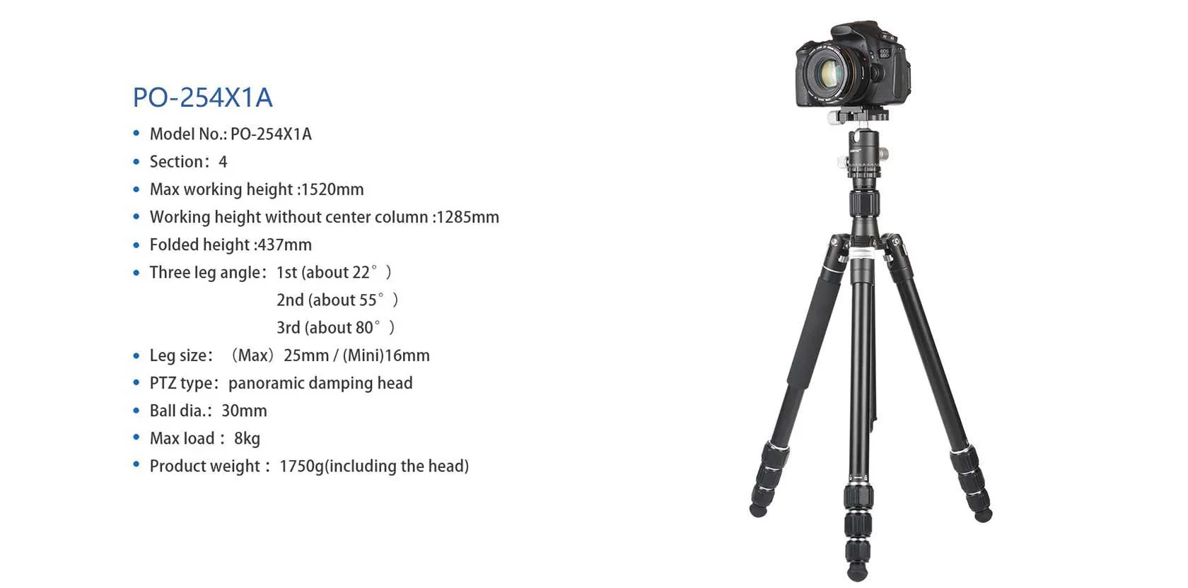 CAVIX PO254X1A Professional Portable Aluminum Alloy Camera Tripod Four Section Set For Canon Nikon Sony Camcorder