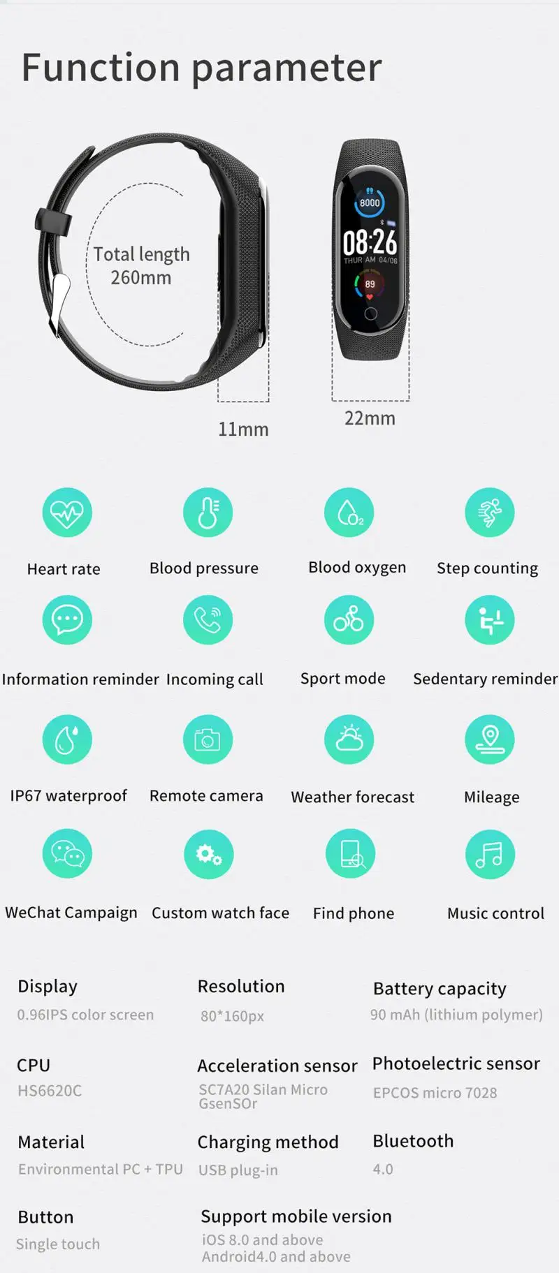 Health Blood pressure, heart rate, blood oxygen, sedentary reminder, sleep monitoring, automatic heart rate monitoring, etc.