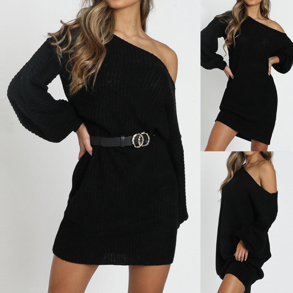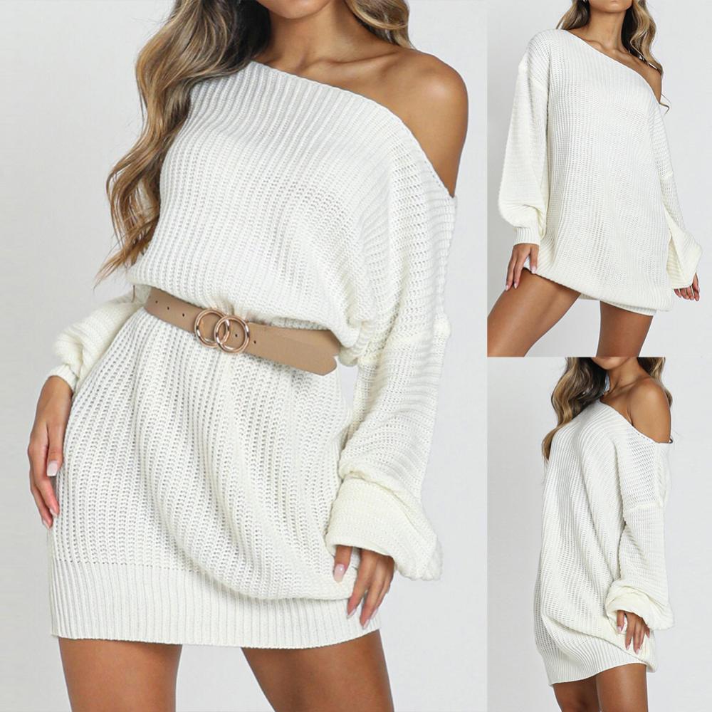 Женское платье-свитер, уличная одежда, Свободный пуловер с длинным рукавом, на одно плечо, с пышными фонариками, теплая туника для отдыха, вязаные джемперы