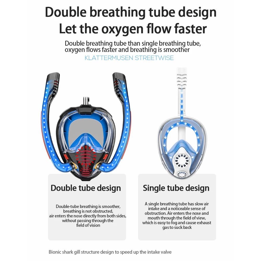 Двойная конструкция дыхательной трубки, делает поток кислорода быстрее и дышать более плавно.
