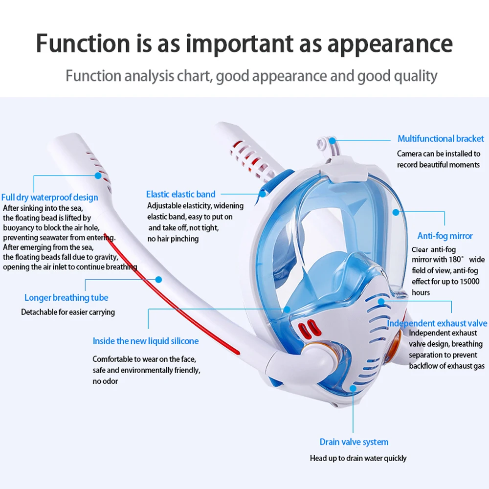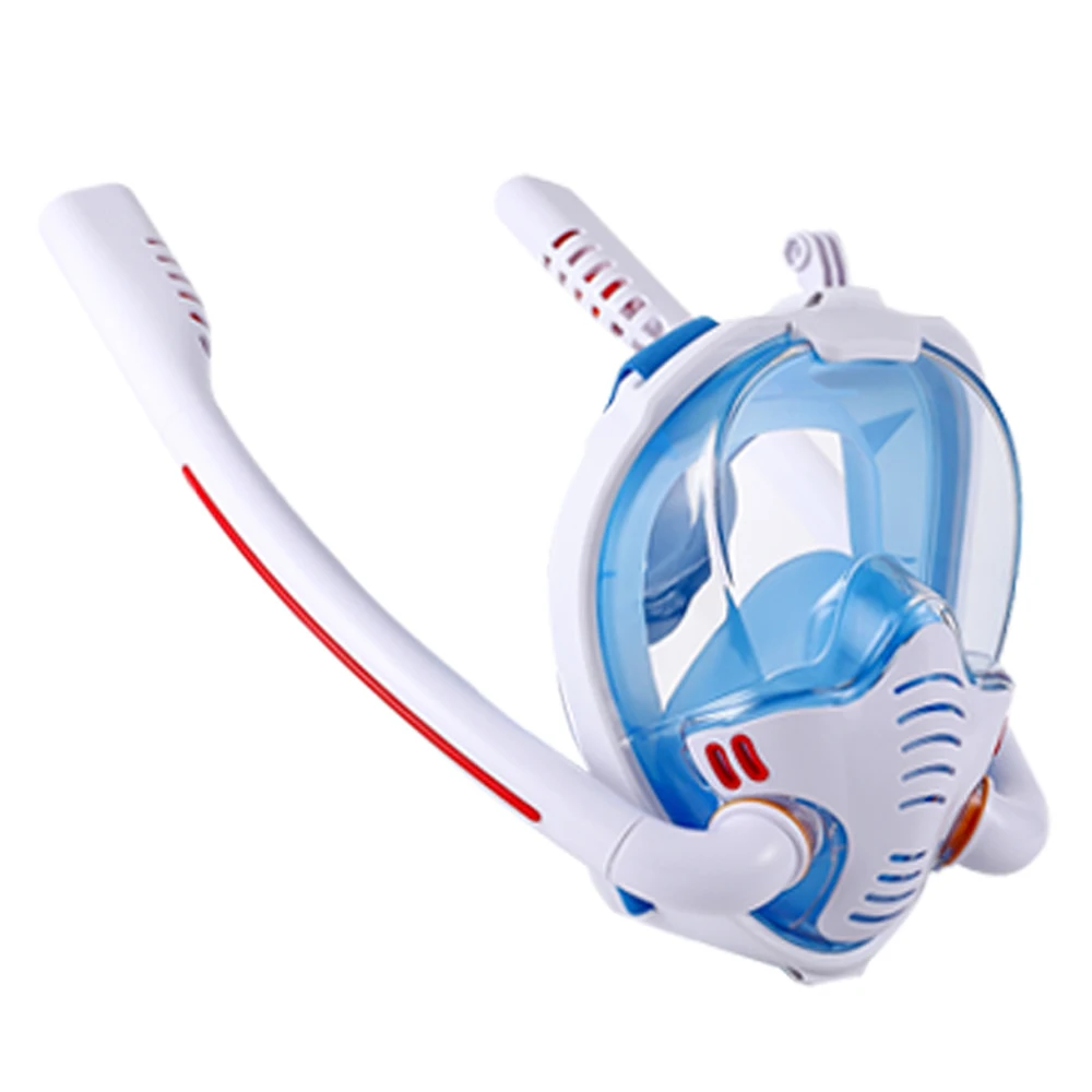 Этот вид маски для подводного плавания может свободно дышать с двойными трубками. Он является водонепроницаемым и имеет широкий обзор. Это может помочь пользователям четко осваивать подводный мир.
