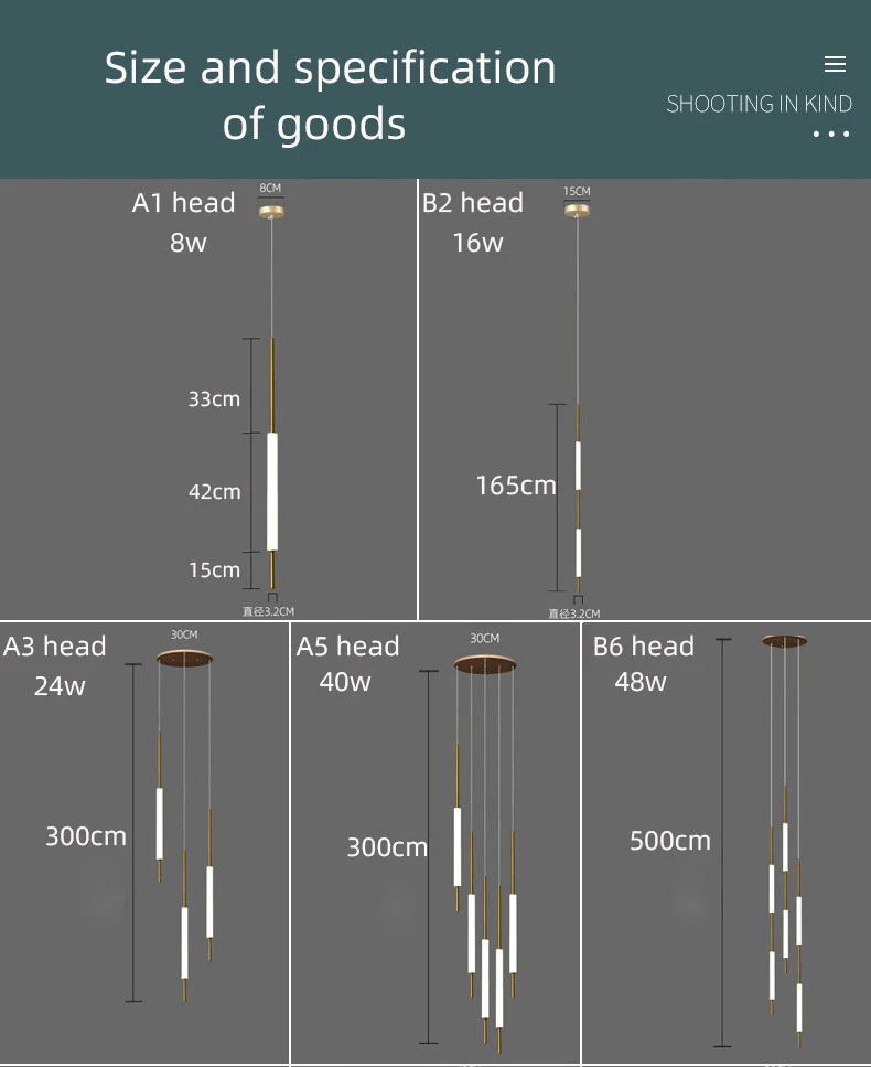 A1 головки: диаметр 3,2 * длина 90 см, общая длина лампа + линии 200 см.