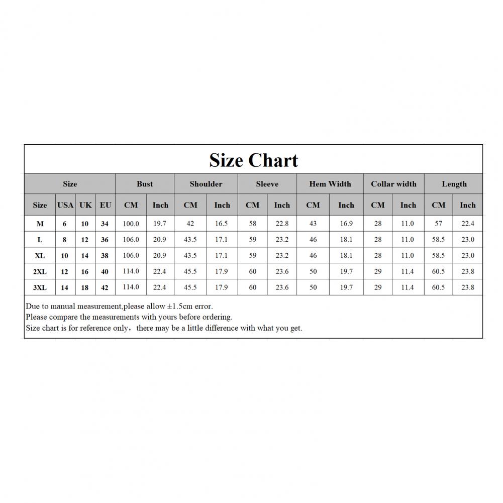Размер: 3XL, обхват груди: 57 см/22,4 дюйма, рукав: 60 см/23,6 дюйма, длина: 60,5 см/23,8 дюйма, ширина плеч: 45,5 см/17,9 дюйма, ширина подола: 50 см/19,7 дюйма, ширина воротника: 29 см/11,4 дюйма (прибл.)
