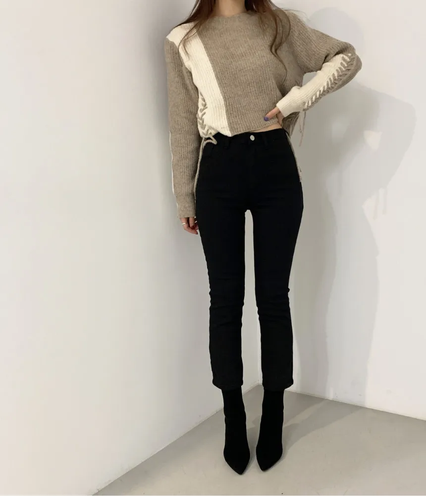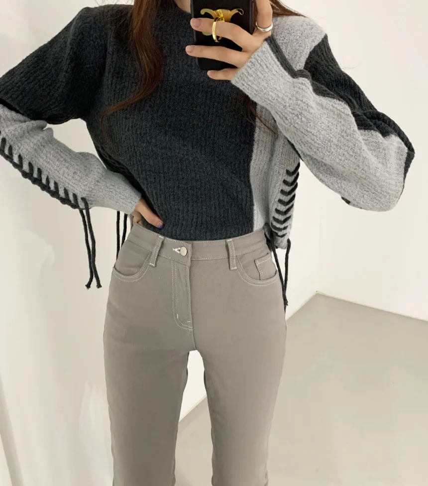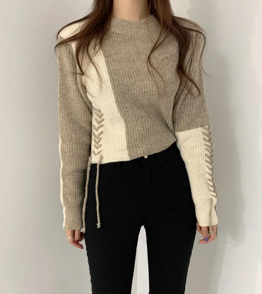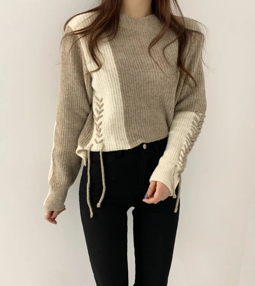 Осенний вязаный свитер для женщин, на шнуровке, в стиле пэчворк, корейские джемпера с круглым вырезом, с длинным рукавом, элегантные пуловеры, в полоску, трикотажная одежда M523