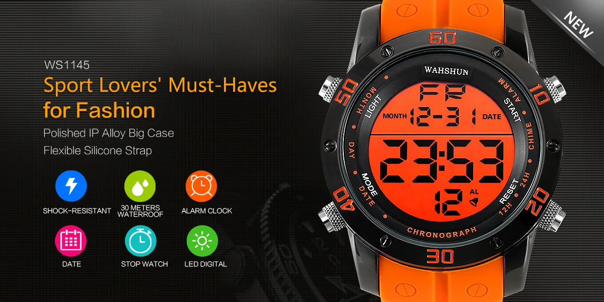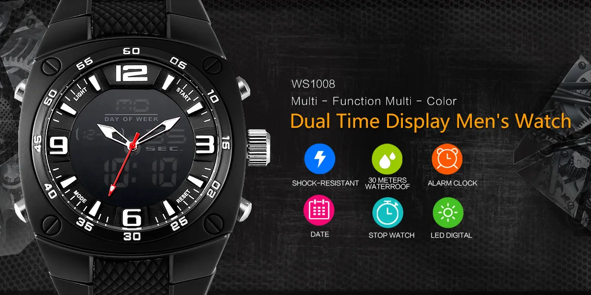 -Двойное движение с новейшим прорывным японским оригинальным цифровым механизмом, Аналоговый светодиодный дисплей, дата, ретранслятор, отображение времени, Будильник, хронограф, водонепроницаемость, полный календарь, светодиодный дисплей, ударопрочный, секундомер, задний светильник