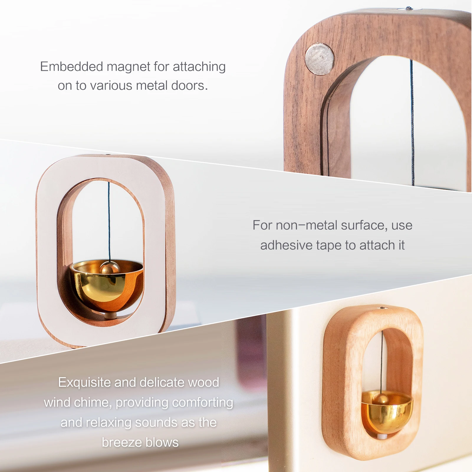A mag-net is embedded in the back of the Wind Chime, allowing it to attach on various metal doors. For non-metal surface, use adhesive tape to attach it.