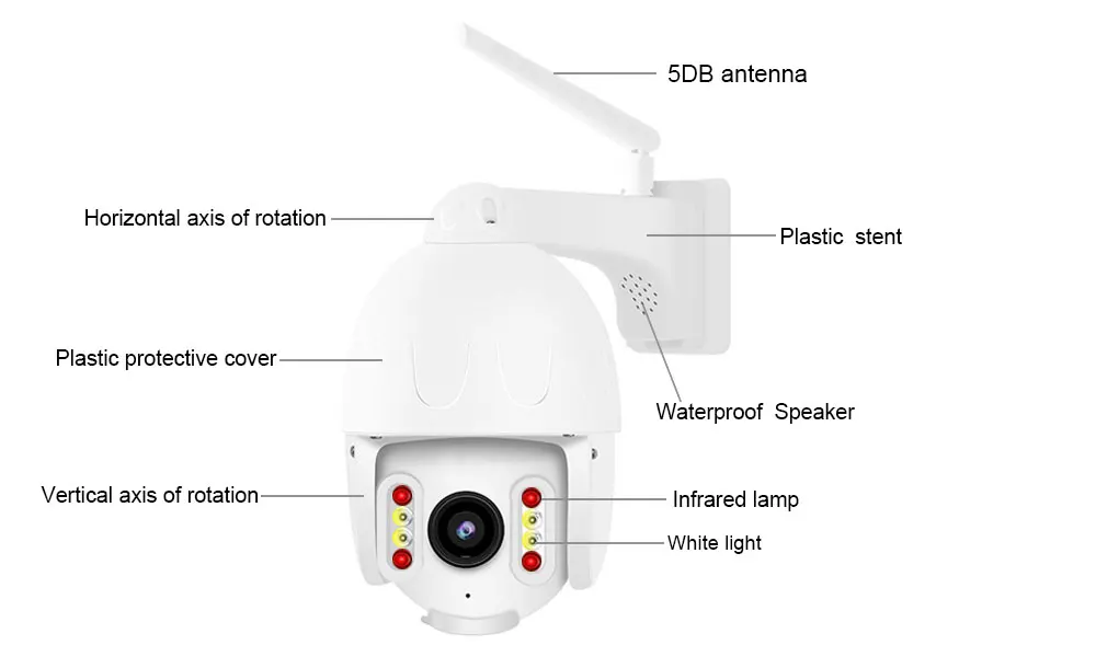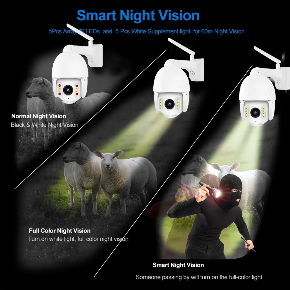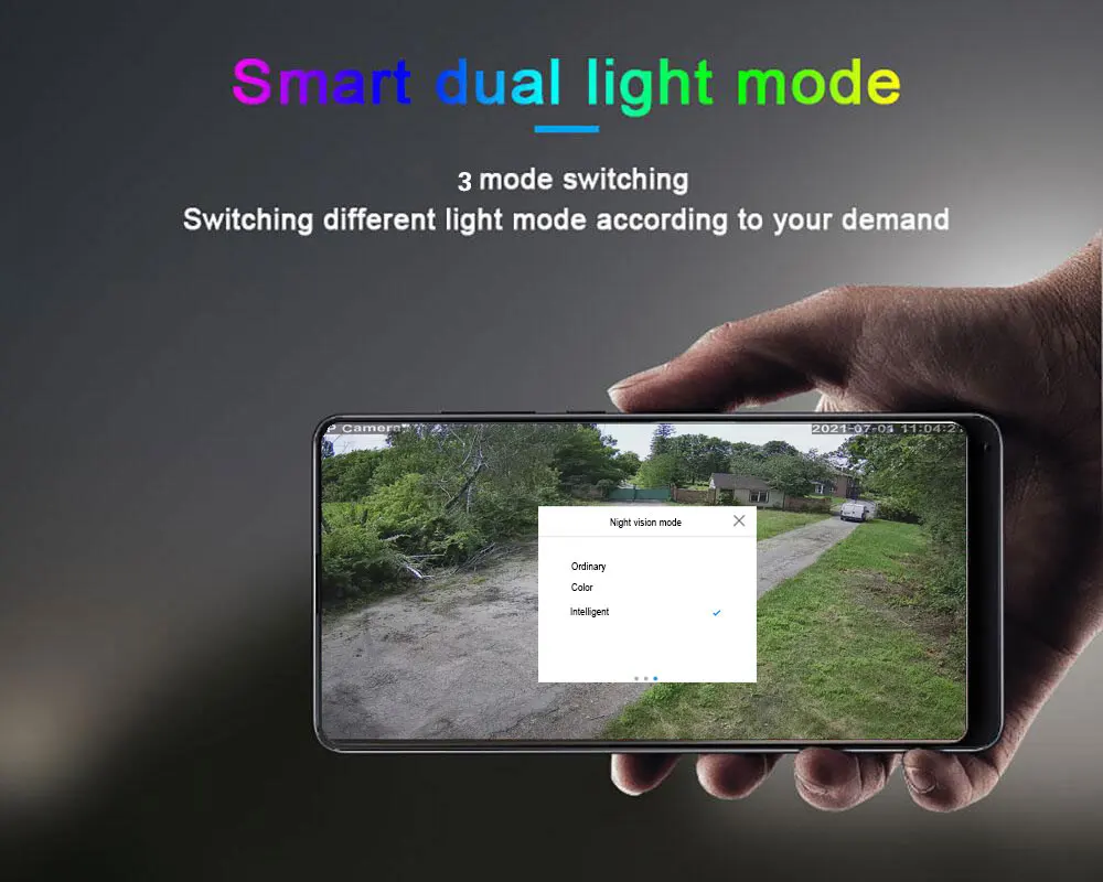 Переключение в режим «умное ночное видение», по умолчанию режим камеры «нормальное ночное видение». Когда кто-то проходит, thigger Функция обнаружения движения камеры, чтобы включить белый светильник. Когда инфракрасный светильник выключен. Переключитесь на «полноцветное ночное видение» и выключите в течение 3 минут. Нормальное зрение, дневной цвет.