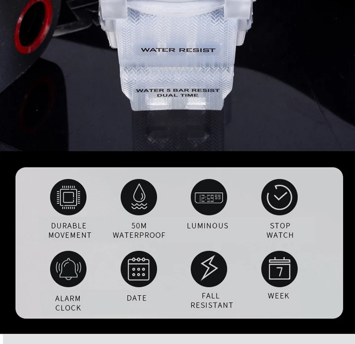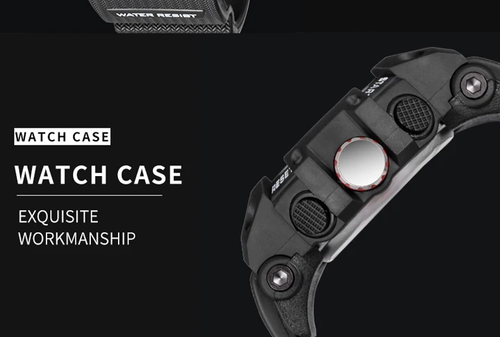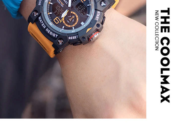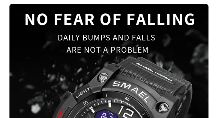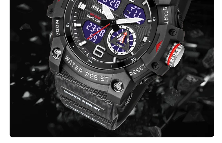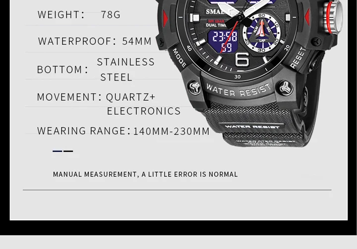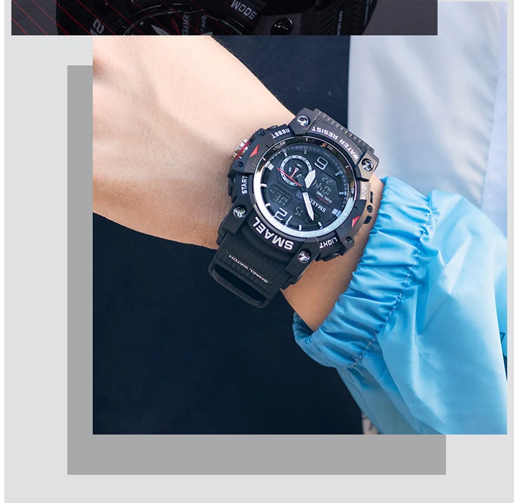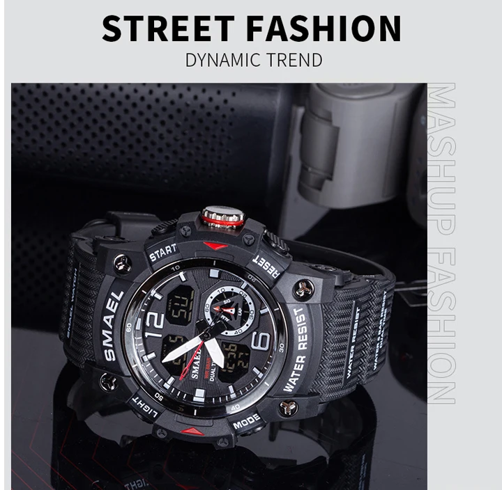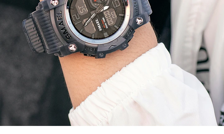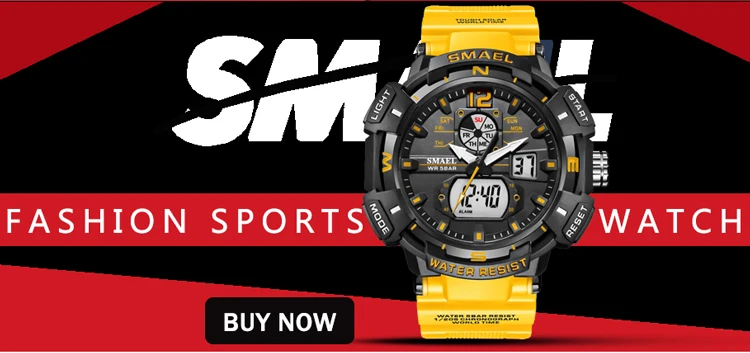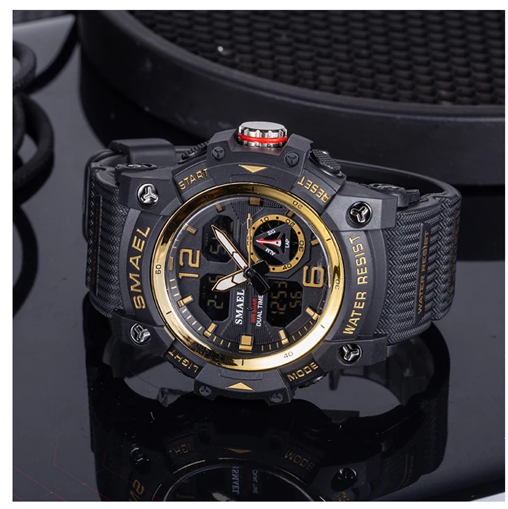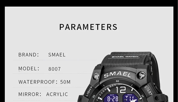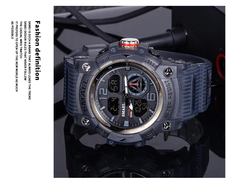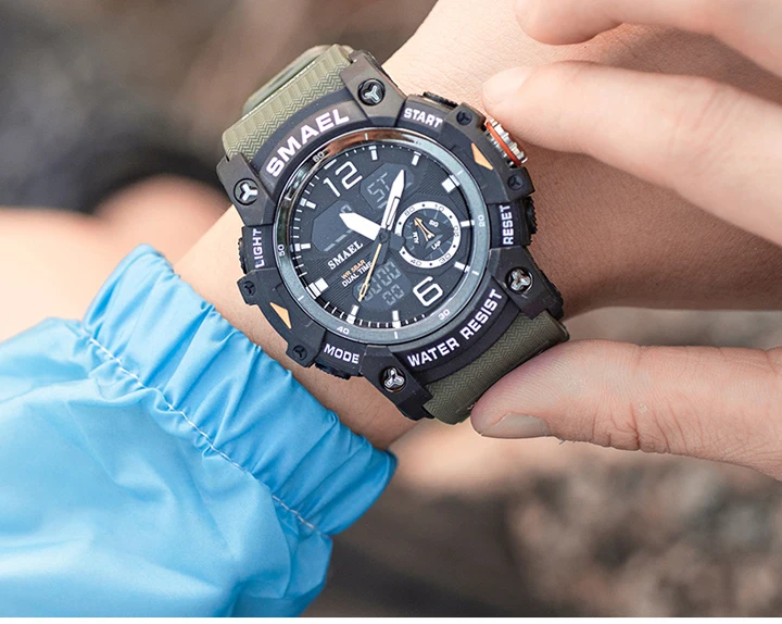 1. Бренд: SMAEL 2. Двойные часы отображаются вместе с включением задней LED-подсветки 3. Водонепроницаемость до 50 м 4. Тип: мужские наручные часы для занятий спортом 5. Механизм: оригинальная японская цифровая индикация 6. 9 цветов на выбор 8. Ширина ремешка: (около) 2.2 см 9. Диаметр циферблата: (приблизительно) 5,4 см 10. Материал ремешка: прочный ПУ 11. Материал корпуса: прочная резина + высокопрочное закаленное стекло 12. Застежка: пряжка 13. Показывают точное время 14. Это хороший подарок для кого-то особенного Примечание: Мы предлагаем вам не носить его во время плавания. Если вы плаваете или ныряете с часами, пожалуйста, не нажимайте никаких кнопок под водой!